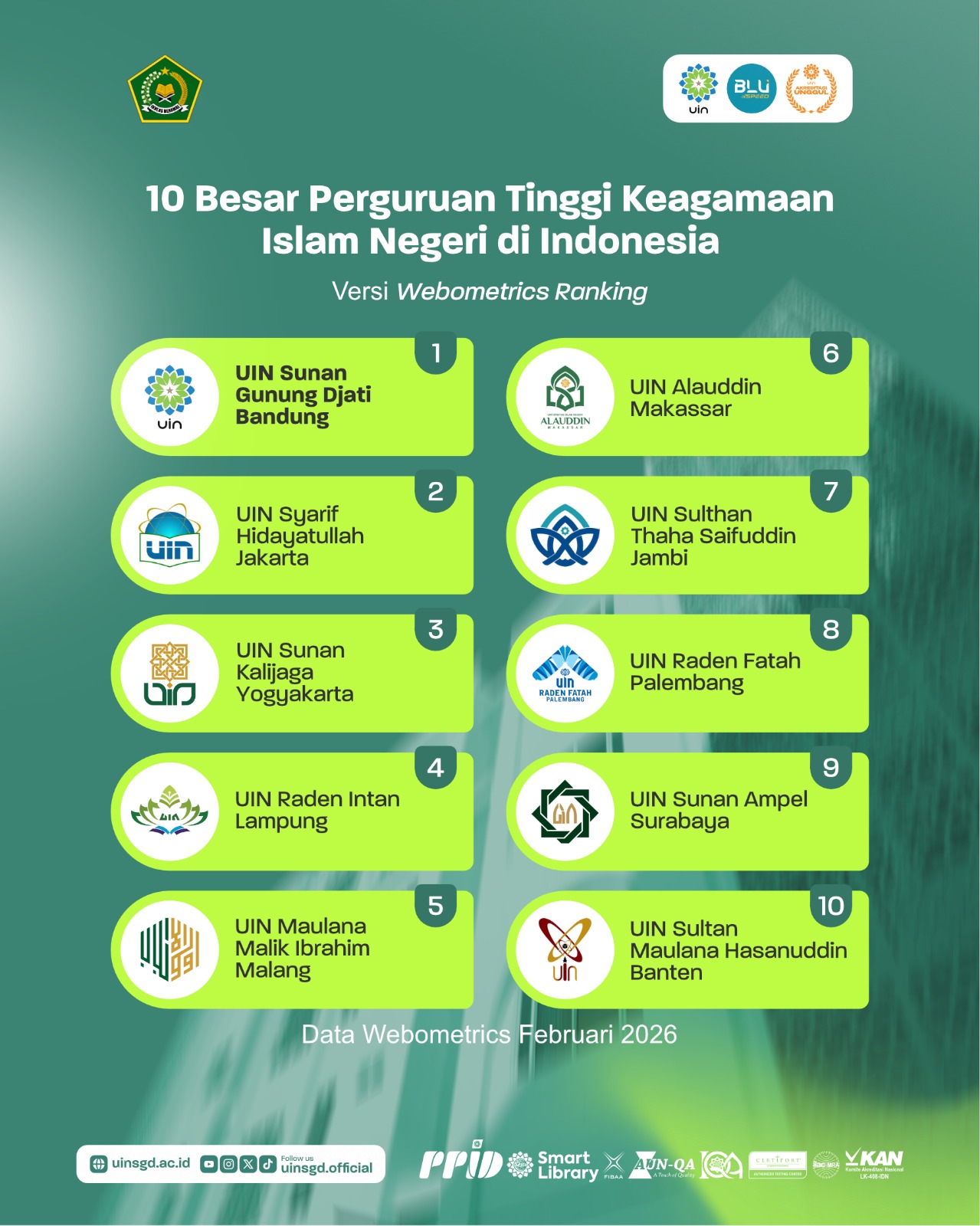 Dalam daftar sepuluh besar PTKIN nasional versi Webometrics 2026, UIN Sunan Gunung Djati Bandung berada di peringkat pertama, diikuti UIN Syarif Hidayatullah Jakarta, UIN Sunan Kalijaga Yogyakarta, UIN Raden Intan Lampung, UIN Maulana Malik Ibrahim Malang, UIN Alauddin Makassar, UIN Sulthan Thaha Saifuddin Jambi, UIN Raden Fatah, UIN Sunan Ampel Surabaya (UINSA), dan UIN Sultan Maulana Hasanuddin (SMH) Banten.