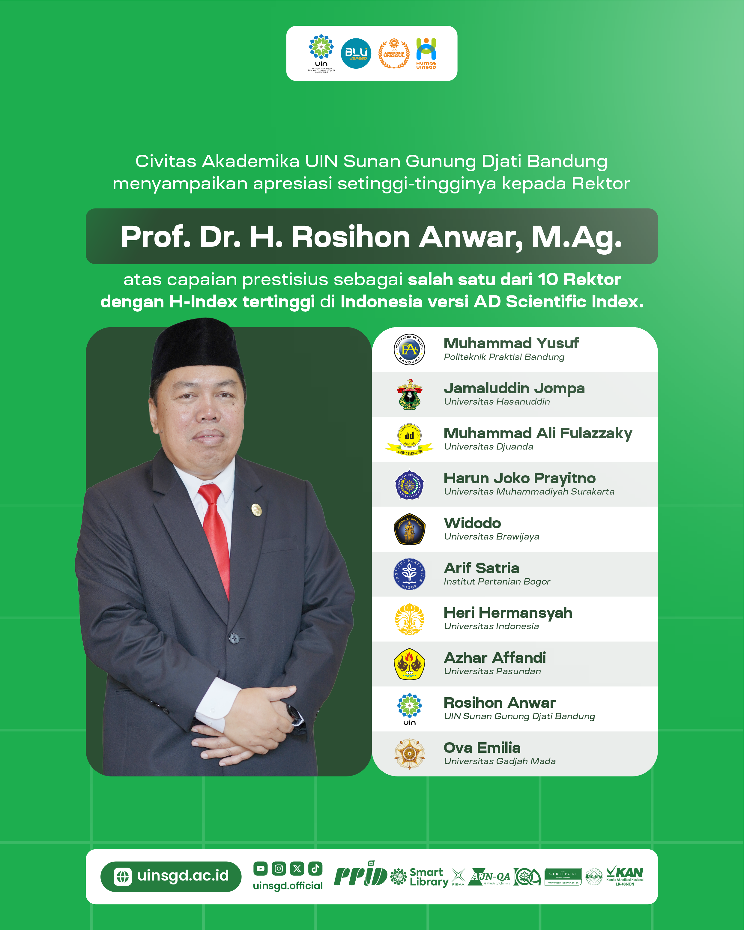 UINSGD.AC.ID (Humas) — Lembaga pemeringkatan AD Scientific Index kembali merilis daftar 10 rektor dengan H-Index tertinggi di Indonesia. Rektor UIN Sunan Gunung Djati Bandung, Prof. Dr. H. Rosihon Anwar, M.Ag., masuk dalam jajaran tersebut dengan capaian H-Index 27.