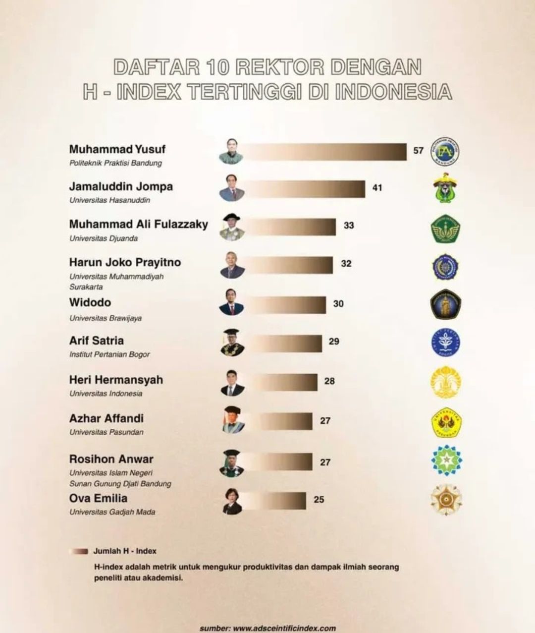 Daftar 10 Rektor dengan H-Index Tertinggi di Indonesia versi AD Scientific Index: