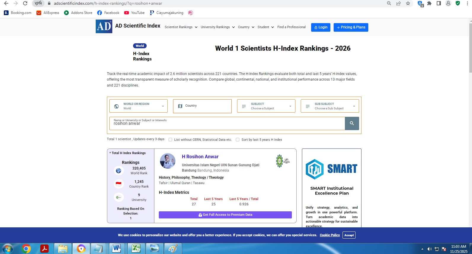 Dilansir dari laman AD Scientific Index, H-Index merupakan indikator penting yang digunakan untuk mengukur produktivitas dan dampak ilmiah seorang akademisi secara global. Capaian ini menunjukkan pengakuan atas kontribusi riset dan produktivitas akademik yang terus dikembangkan di UIN Bandung.