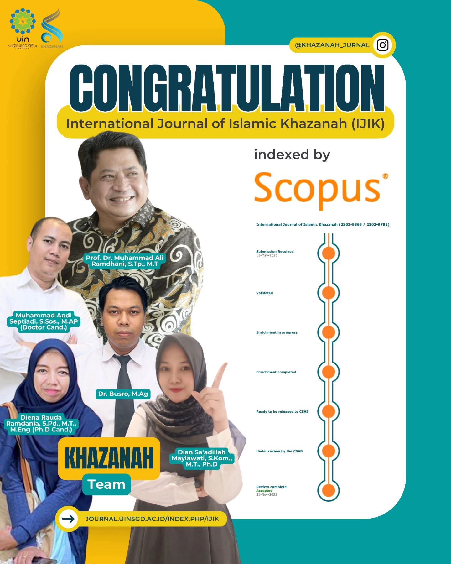 Pengelola IJIK, Muhammad Ali Ramdhani (editor in chief), Busro (managing editor), Muhammad Andi Septiadi (editor board), Dian Sa’adillah Maylawati dan Diena Rauda Ramdania (administrator and assistant to editor) menyampaikan rasa syukur atas capaian ini. “Alhamdulillah, International Journal of Islamic Khazanah (IJIK) terindeks Scopus. Hadiah kecil dari kami untuk UIN Sunan Gunung Djati Bandung tercinta. Kami dari Khazanah Series mengucapkan terima kasih atas dukungan dan doa semua pihak, khususnya Rektor dan jajaran pimpinan,” tegasnya, Sabtu (22/11/2025).
