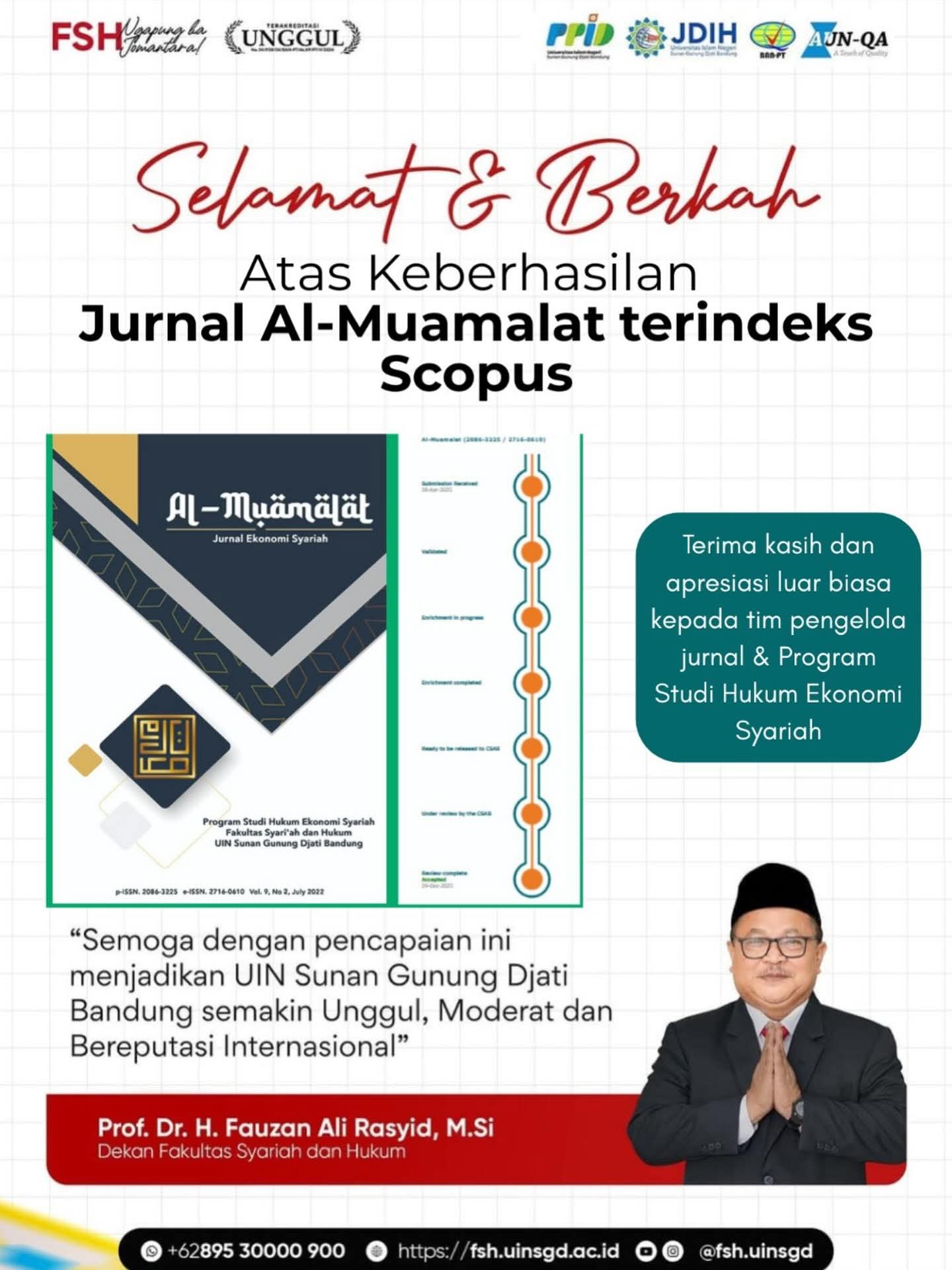 “Keberhasilan Jurnal Al-Muamalat terindeks Scopus merupakan tonggak penting bagi Fakultas Syariah dan Hukum. Ini membuktikan bahwa pengembangan keilmuan ekonomi syariah yang kami lakukan mampu memperoleh pengakuan internasional. Terima kasih dan apresiasi luar biasa kepada tim pengelola jurnal dan Program Studi Hukum Ekonomi Syariah. Semoga dengan pencapaian ini menjadikan UIN Sunan Gunung Djati Bandung semakin unggul, moderat, dan bereputasi internasional,” ujarnya.