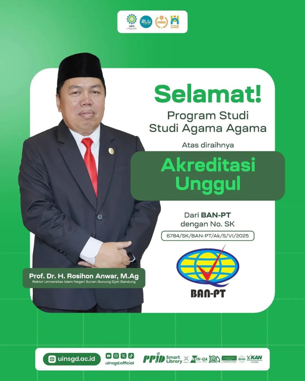 UINSGD.AC.ID (Humas) — Program Studi (Prodi) Studi Agama-Agama, Fakultas Ushuluddin, UIN Sunan Gunung Djati Bandung, berhasil meraih Akreditasi Unggul dari Badan Akreditasi Nasional Perguruan Tinggi (BAN-PT). Keputusan ini tertuang dalam Surat Keputusan BAN-PT Nomor: 6784/SK/BAN-PT/Ak/S/VI/2025.