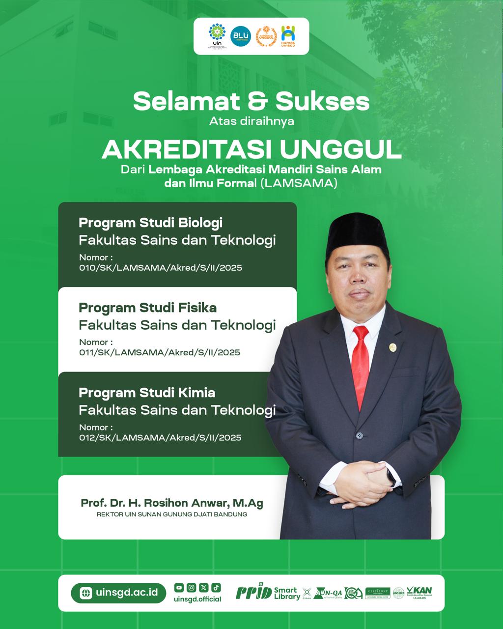 “Alhamdulillah, segala puji bagi Allah SWT atas rahmat dan karunia-Nya. Program Studi Biologi, Fisika, dan Kimia UIN Bandung berhasil meraih predikat Unggul dari LAMSAMA. Prestasi ini patut kita syukuri bersama. Terima kasih kepada Bapak Rektor, para Wakil Rektor, para Kepala Biro, serta seluruh tim akreditasi Prodi yang telah berkontribusi dalam proses ini. Tak lupa apresiasi sebesar-besarnya kepada LPM, LP2M, SPI, dosen, tenaga kependidikan, mahasiswa, alumni, stakeholder, security atau satpam, cleaning service atau OB dan seluruh yang telah bekerja keras dengan penuh dedikasi. Keberhasilan ini adalah bukti nyata dari kerja sama yang solid dan semangat bersama untuk terus meningkatkan kualitas pendidikan di UIN Bandung,” ujarnya.