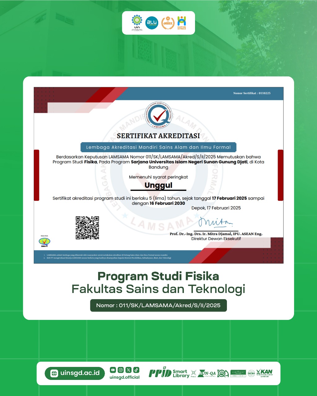 2. Prodi Fisika: Keputusan LAMSAMA Nomor 011/SK/LAMSAMA/Akred/S/II/2025. Sertifikat akreditasi berlaku selama 5 tahun, mulai 17 Februari 2025 – 16 Februari 2030.