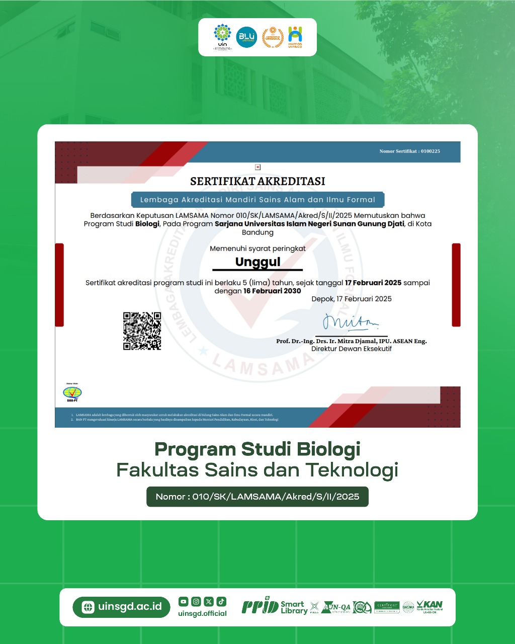 1. Prodi Biologi: Keputusan LAMSAMA Nomor 010/SK/LAMSAMA/Akred/S/II/2025. Sertifikat akreditasi berlaku selama 5 tahun, mulai 17 Februari 2025 – 16 Februari 2030.