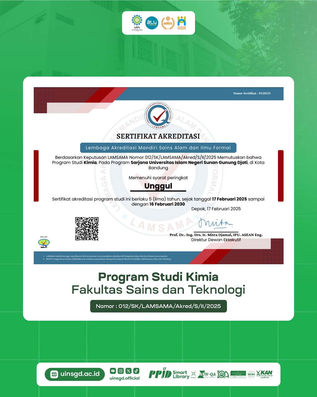 3. Prodi Kimia: Keputusan LAMSAMA Nomor 012/SK/LAMSAMA/Akred/S/II/2025. Sertifikat akreditasi berlaku selama 5 tahun, mulai 17 Februari 2025 – 16 Februari 2030.