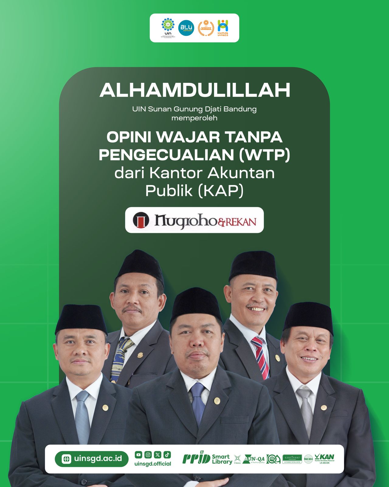 UINSGD.AC.ID (Humas) — Universitas Islam Negeri (UIN) Sunan Gunung Djati Bandung kembali menorehkan prestasi membanggakan. Berdasarkan hasil audit atas Laporan Keuangan Tahun Buku 2024 oleh auditor eksternal Kantor Akuntan Publik (KAP) Nugroho & Rekan, UIN Bandung meraih opini Wajar Tanpa Pengecualian (WTP).