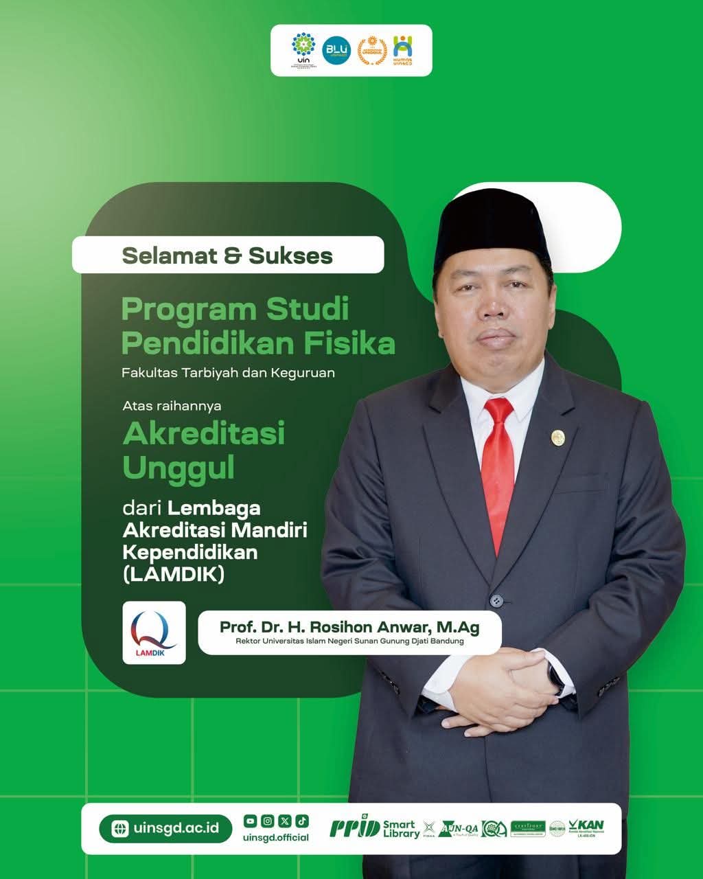 UINSGD.AC.ID (Humas) — Program Studi (Prodi) Pendidikan Fisika Jurusan Pendidikan MIPA, Fakultas Tarbiyah dan Keguruan (FTK) Universitas Islam Negeri (UIN) Sunan Gunung Djati Bandung berhasil meraih peringkat akreditasi Unggul dari Lembaga Akreditasi Mandiri Kependidikan (LAMDIK).