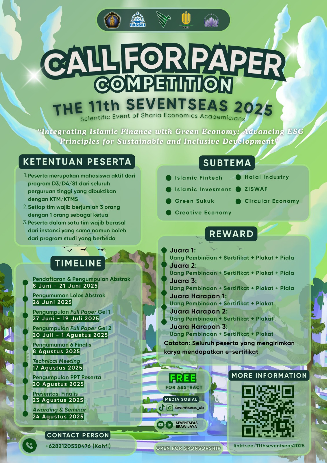 SEVENTSEAS (Scientific Event of Sharia Economics Academicians) merupakan agenda tahunan berskala nasional yang tahun ini memasuki penyelenggaraan ke-11. Tema yang diusung bertajuk “Integrating Islamic Finance with Green Economy: Advancing ESG Principles for Sustainable and Inclusive Development.”