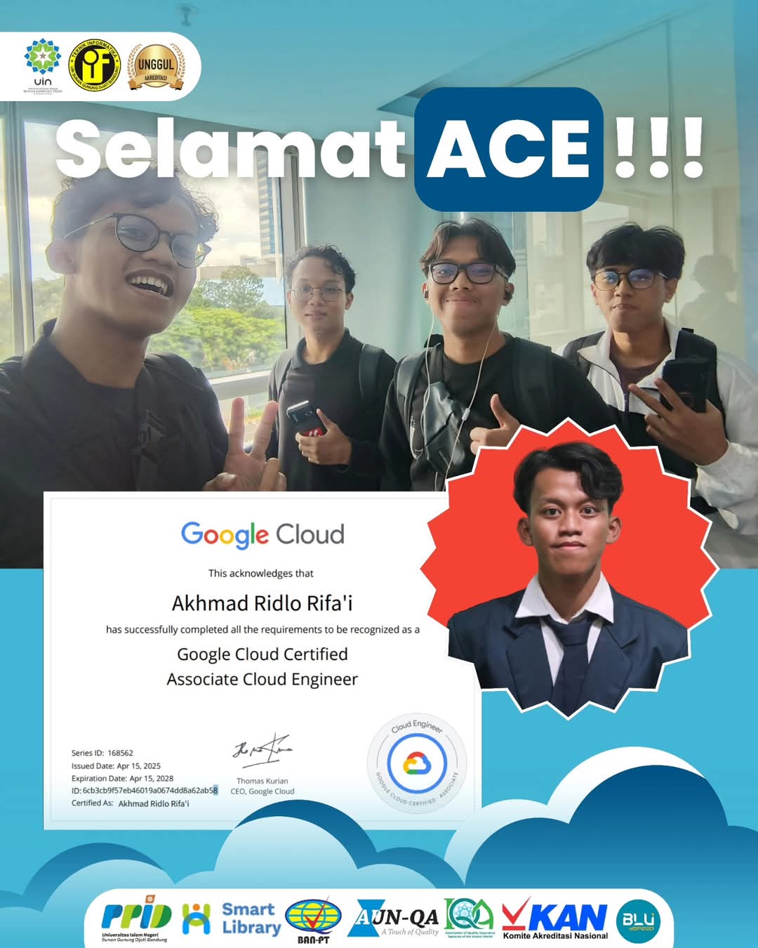 Prestasi Ridho dalam meraih sertifikasi profesional Google Associate Cloud Engineer (ACE) merupakan bukti nyata dari dedikasi, kerja keras, dan kompetensi yang unggul di bidang komputasi awan. Sertifikasi ini tidak hanya membuktikan kemampuan individu dalam mengelola solusi berbasis Google Cloud, tetapi juga menempatkan mahasiswa kita di jajaran talenta digital yang siap bersaing di tingkat nasional maupun global.