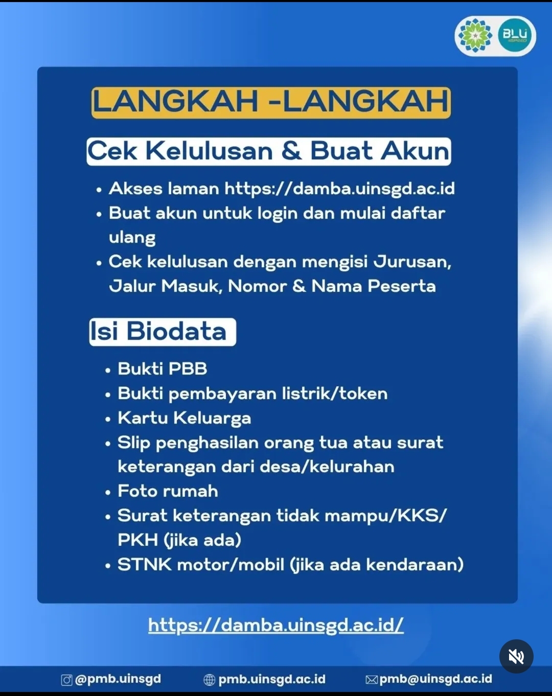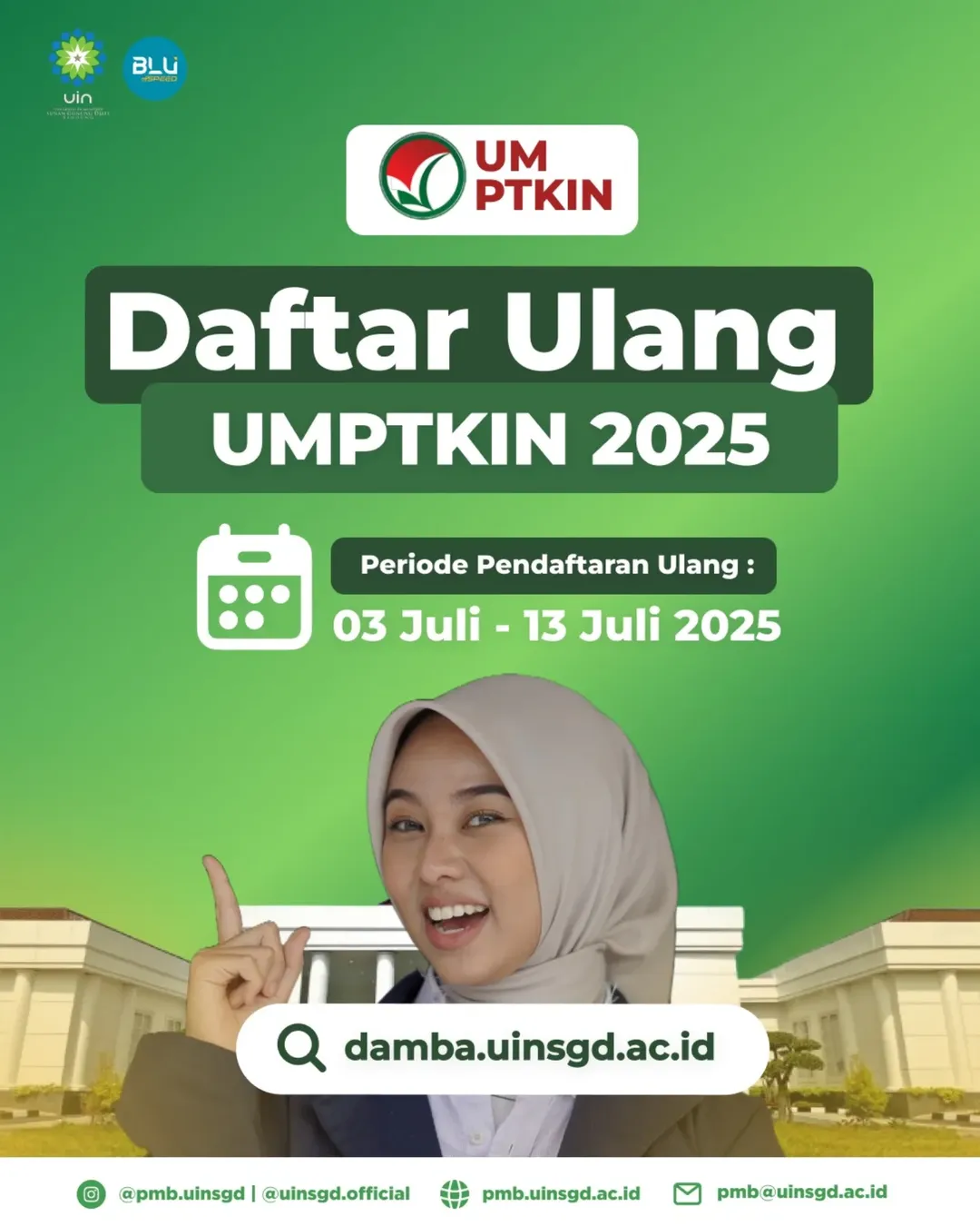 UINSGD.AC.ID (Humas) — Universitas Islam Negeri (UIN) Sunan Gunung Djati Bandung resmi mengumumkan jadwal daftar ulang bagi calon mahasiswa baru yang lolos melalui jalur Ujian Masuk Perguruan Tinggi Keagaman Islam Negeri (UM-PTKIN) tahun 2025. Proses daftar ulang dilaksanakan secara daring mulai tanggal 3 hingga 13 Juli 2025 melalui laman: https://damba.uinsgd.ac.id.