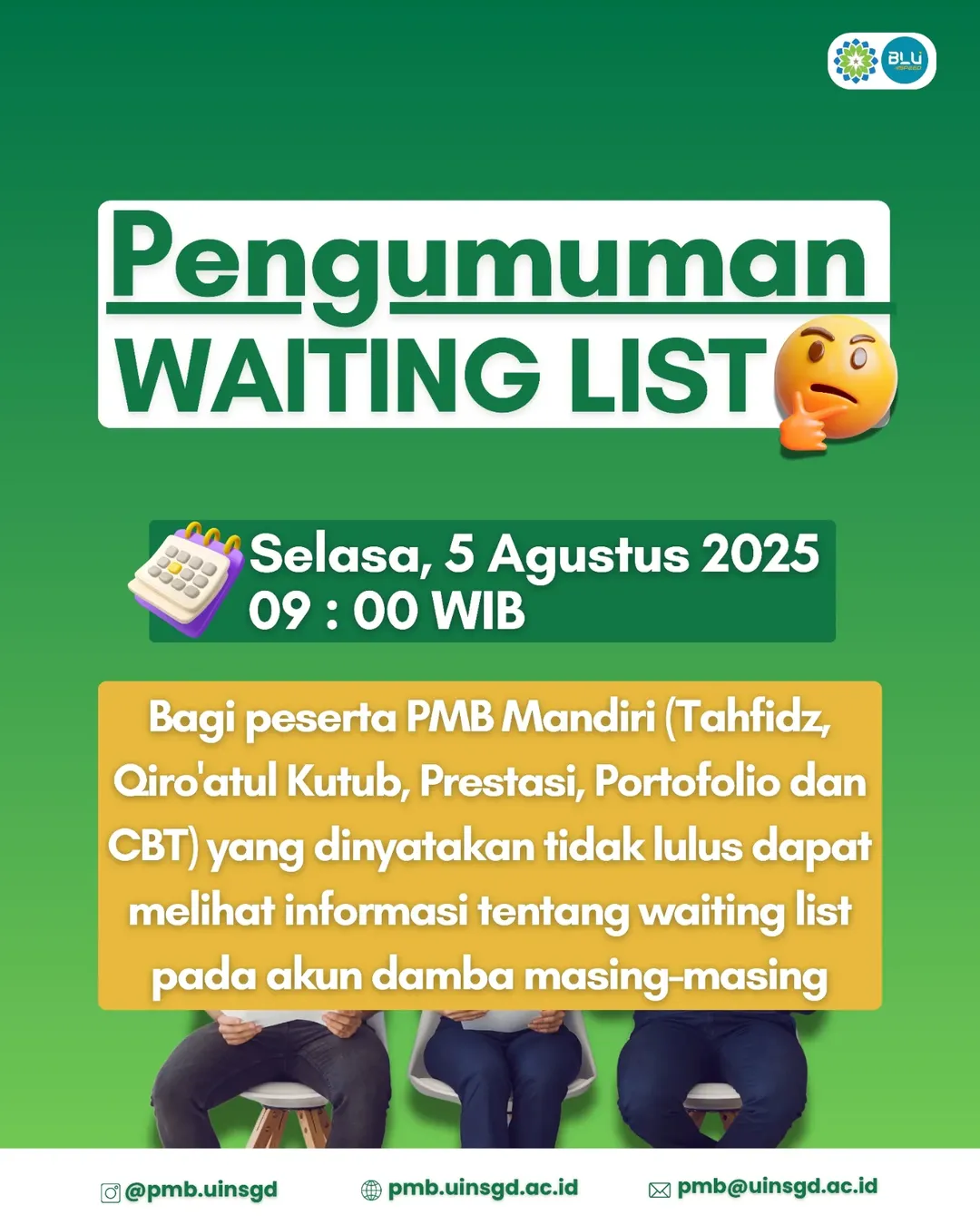 UINSGD.AC.ID (Humas) – UIN Sunan Gunung Djati Bandung secara resmi membuka pengumuman waiting list bagi peserta Penerimaan Mahasiswa Baru (PMB) Mandiri Tahun 2025 mulai hari ini, Selasa, 5 Agustus 2025 pukul 09.00 WIB.