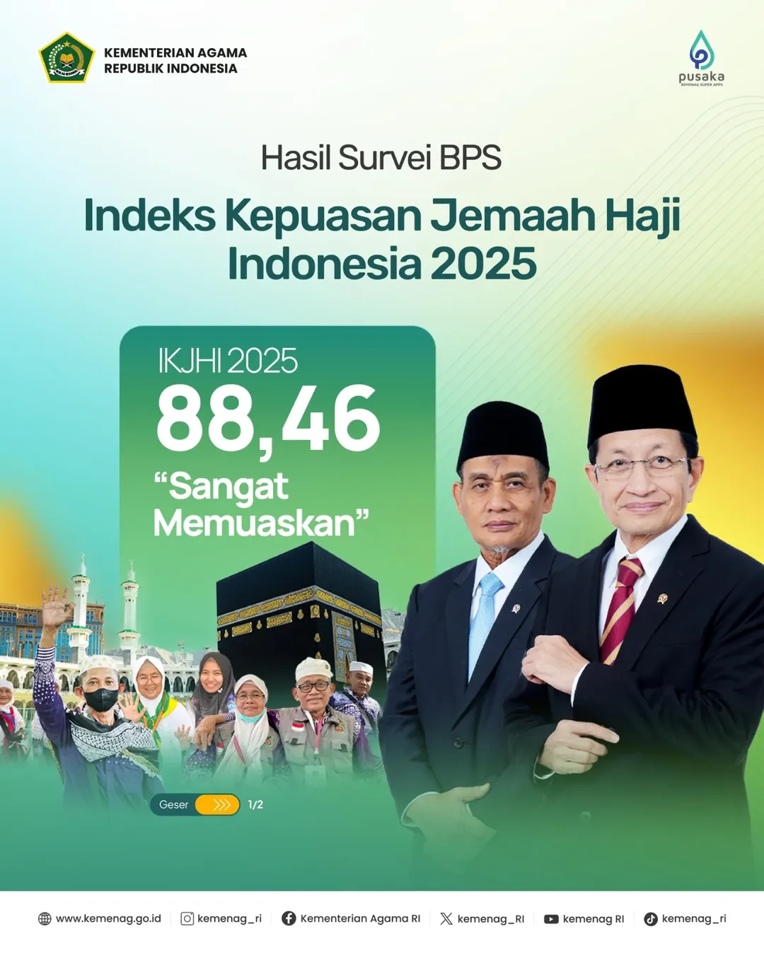“Alhamdulillah! Indeks Kepuasan Jemaah Haji 2025 Capai Angka Sangat Memuaskan Hasil survei BPS menunjukkan Indeks Kepuasan Jemaah Haji Indonesia (IKJHI) 2025 mencapai skor 88,46, dengan kategori Sangat Memuaskan. Ini adalah pencapaian berkat kerja keras seluruh petugas haji dalam memberikan pelayanan terbaik. Sejumlah layanan mendapat apresiasi tertinggi, seperti Transportasi Bus Shalawat (92,15) dan Transportasi Bus Antarkota (91,62). Tentu, hasil ini menjadi motivasi bagi kami untuk terus berbenah, terutama pada aspek layanan yang masih perlu ditingkatkan, seperti akomodasi tenda. Terima kasih atas kepercayaan jemaah. Capaian ini memotivasi untuk terus tingkatkan layanan haji dan layanan publik lainnya.”