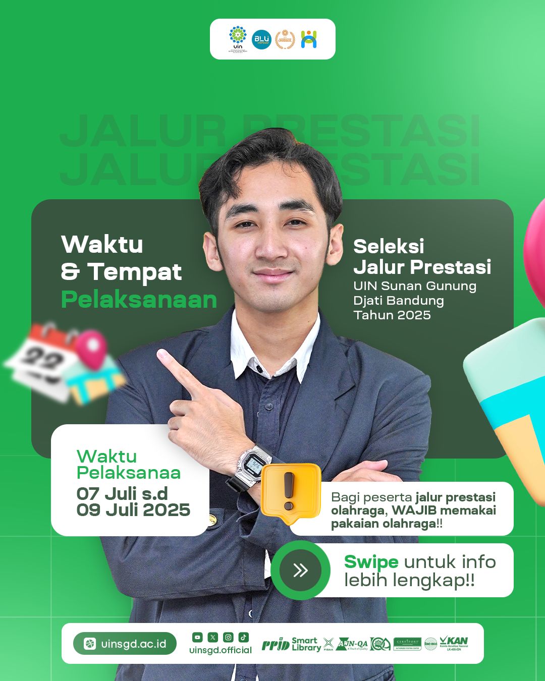 Jalur prestasi ini menjadi bukti nyata bahwa UIN Bandung terus berupaya mendorong mahasiswa yang memiliki keunggulan non-akademik agar dapat berkembang dan berkontribusi aktif di lingkungan kampus. Tidak hanya sebagai ajang seleksi, kegiatan ini juga menjadi wahana aktualisasi diri dan penguatan karakter calon mahasiswa baru.