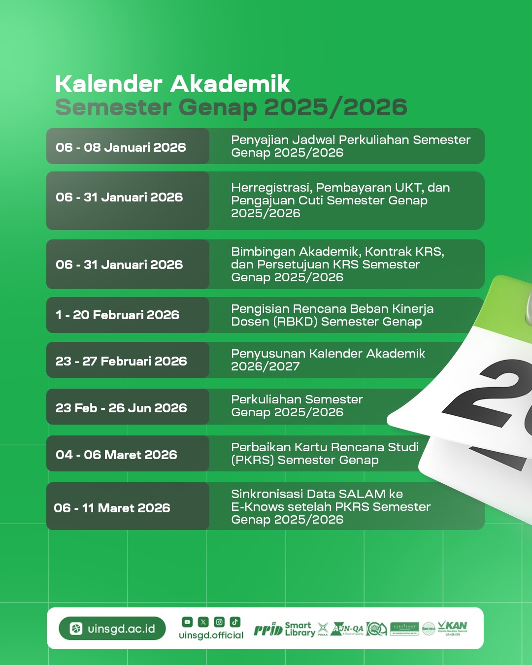 Berikut kami informasikan Kalender Akademik Semester Genap Tahun Akademik 2025/2026 UIN Sunan Gunung Djati Bandung. Kamu bisa akses lengkapnya di sini: