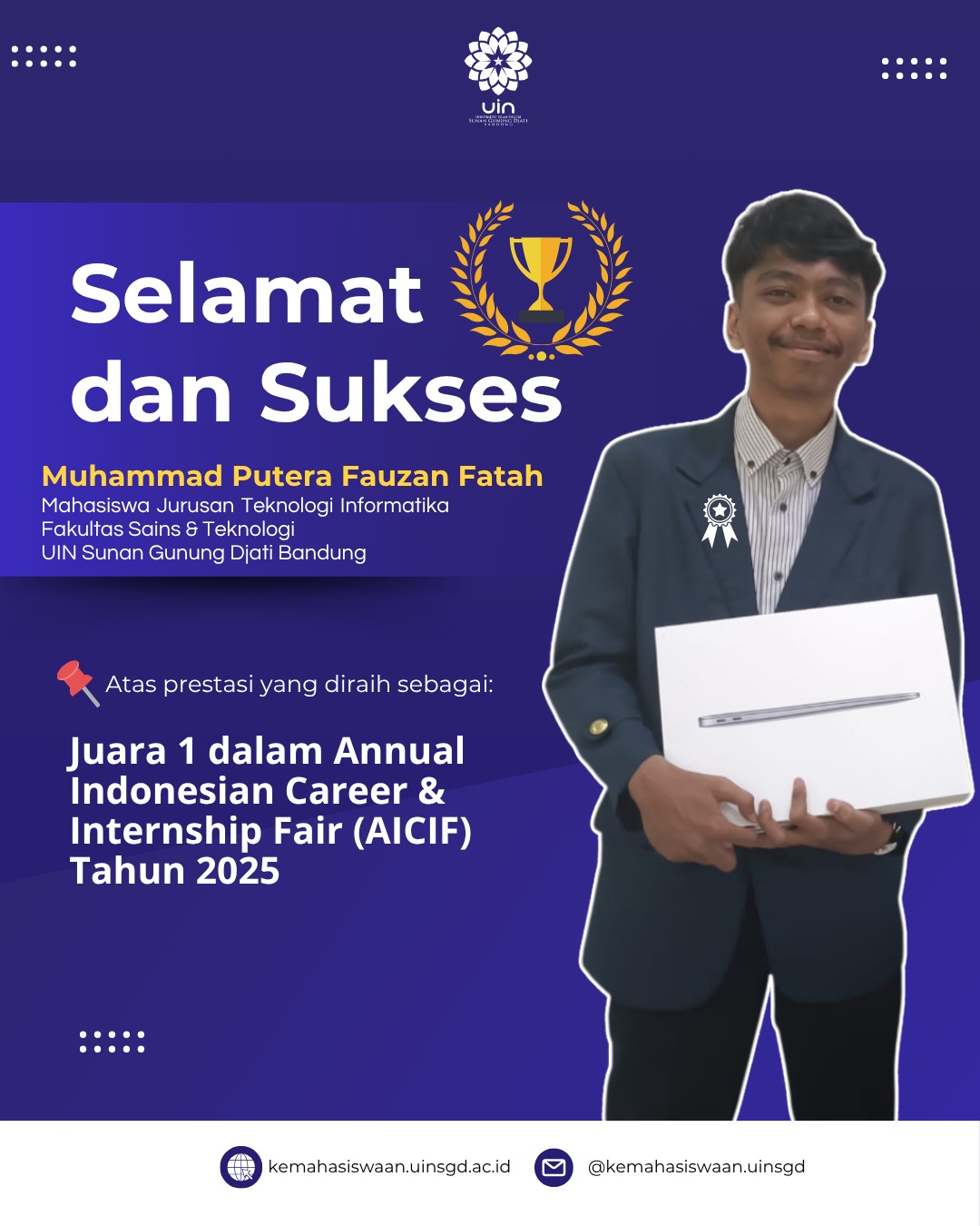 “Ini adalah sebuah pencapaian yang sangat membanggakan, bukan hanya bagi pribadi mahasiswa yang bersangkutan, tetapi juga bagi seluruh keluarga besar UIN SGD Bandung. Prestasi ini menunjukkan bahwa mahasiswa kita memiliki daya saing yang tinggi, mampu bersaing secara nasional, dan siap menghadapi tantangan dunia kerja masa kini. Saya mengucapkan terima kasih dan apresiasi yang setinggi-tingginya kepada penyelenggara AICIF 2025, yang telah memberikan wadah yang begitu berharga bagi mahasiswa Indonesia untuk tumbuh, belajar, dan menunjukkan potensi terbaik mereka,” jelasnya.