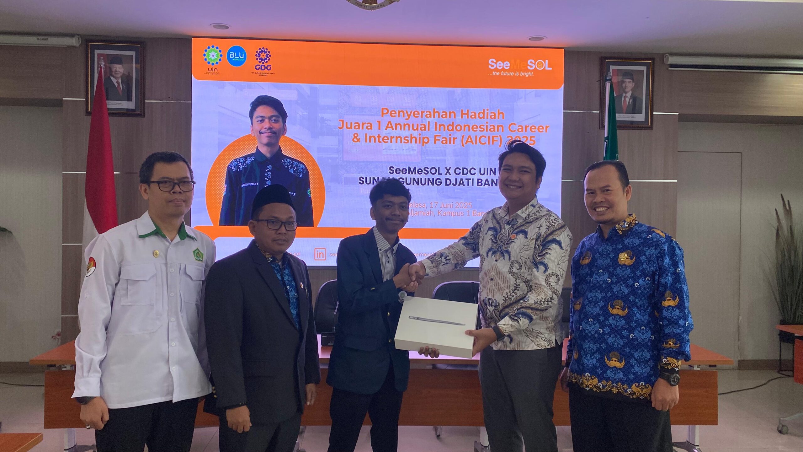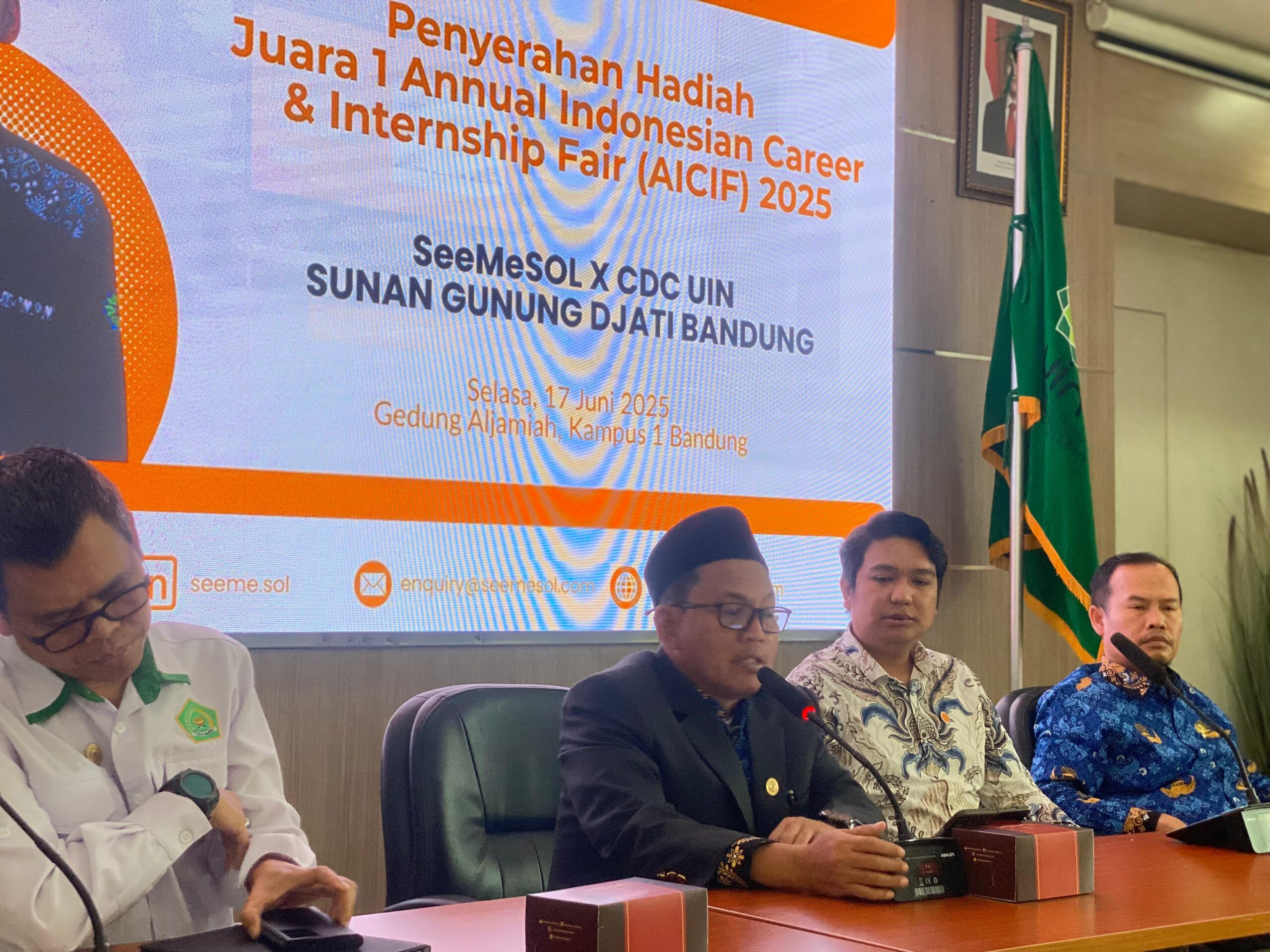 Kepala Career Development Center (CDC) UIN Bandung, Dr. Heri Gunawan, S.Pd.I., M.Ag., turut menyampaikan apresiasinya. “Sebagai Kepala CDC, saya mengucapkan selamat atas capaian luar biasa ini. AICIF 2025 adalah job fair virtual yang diselenggarakan oleh SeeMeSOL bekerja sama dengan seluruh CDC perguruan tinggi di Indonesia, termasuk CDC UIN SGD Bandung. SeeMeSOL, lembaga job portal berbasis di Singapura, diharapkan dapat terus menjembatani pengembangan karier mahasiswa dan rekrutmen lulusan,” paparnya.
