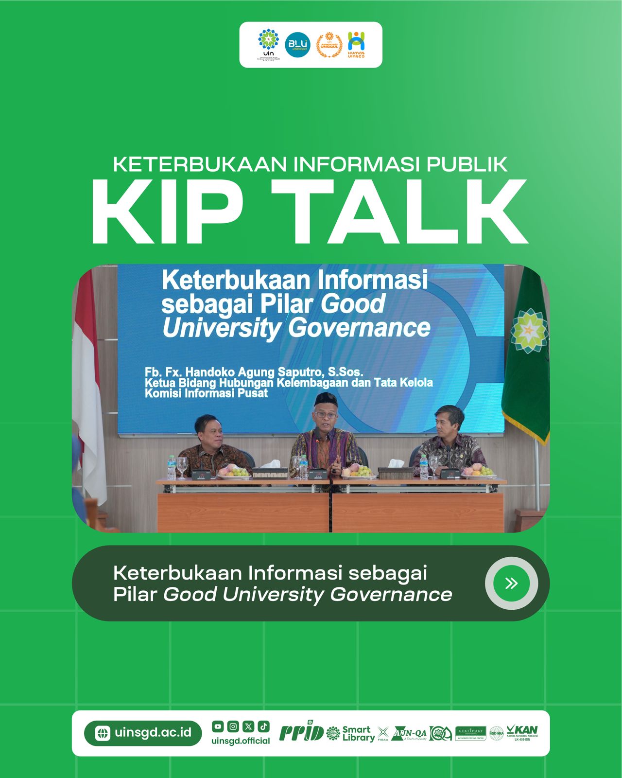 Hadirnya Duta Keterbukaan Informasi Publik 2024 menjadi ikhtiar untuk mengimplementasikan keterbukaan informasi publik menjadi komitmen bersama pimpinan demi meraih badan publik dengan kualifikasi lembaga informatif. “Hari ini ketiga duta KIP hadir dan membersamai acara KIP Talk. Semuanya itu dilakukan dalam rangka meningkatkan keterbukaan informasi sebagai pilar good university governance,” jelasnya.
