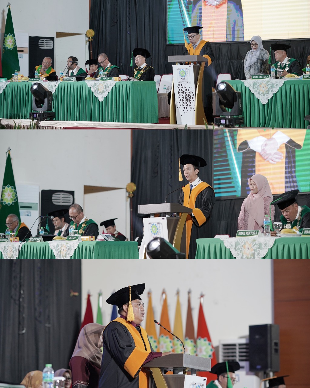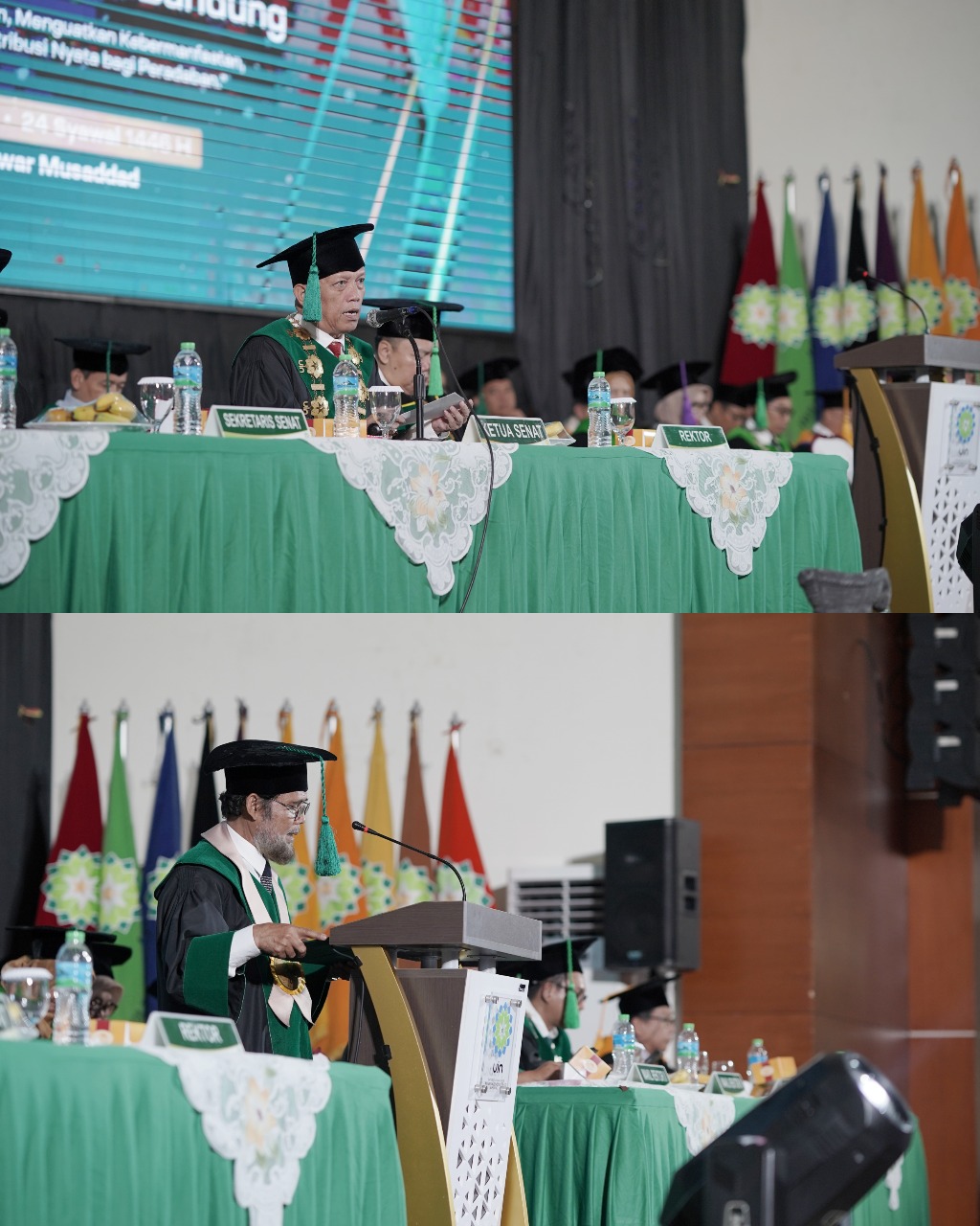 Ketua Senat Universitas, Prof. Dr. H. Mahmud, M.Si., dalam pembukaannya menyebut pengukuhan ini sebagai bentuk akselerasi mutu akademik dan kontribusi nyata kampus dalam pengembangan ilmu pengetahuan berbasis keislaman dan kebangsaan.
