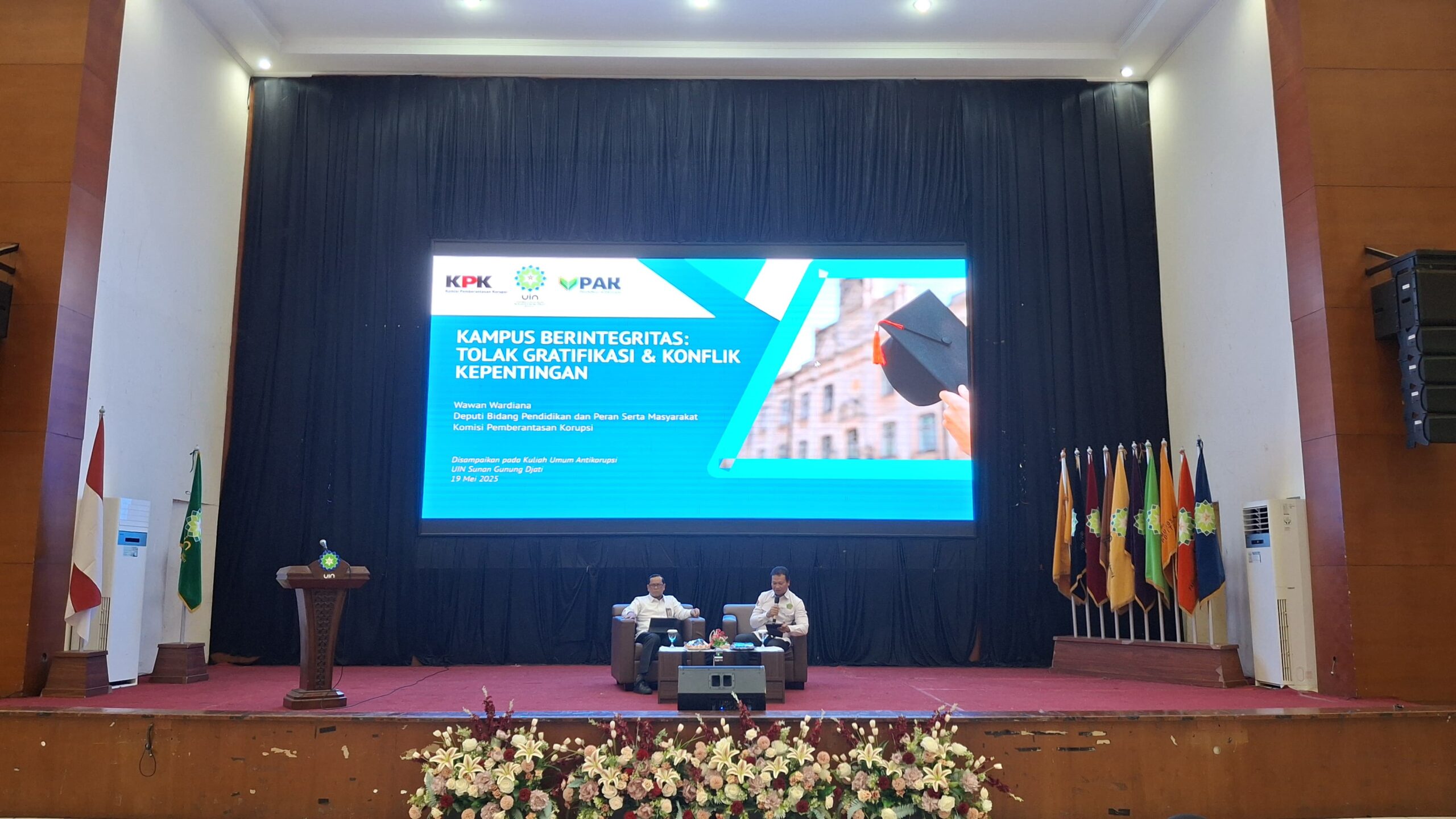 Kuliah umum ini menghadirkan narasumber dari Komisi Pemberantasan Korupsi Republik Indonesia (KPK RI), Dr. Ir. Wawan Wardiana, M.T, selaku Deputi Pendidikan dan Peran Serta Masyarakat. Acara dipandu oleh Ketua Lembaga Penjaminan Mutu (LPM), yang juga bertindak sebagai Ketua Tim Penguatan Integritas UIN Bandung, Prof. Dr. H. Ija Suntana, M.Ag.