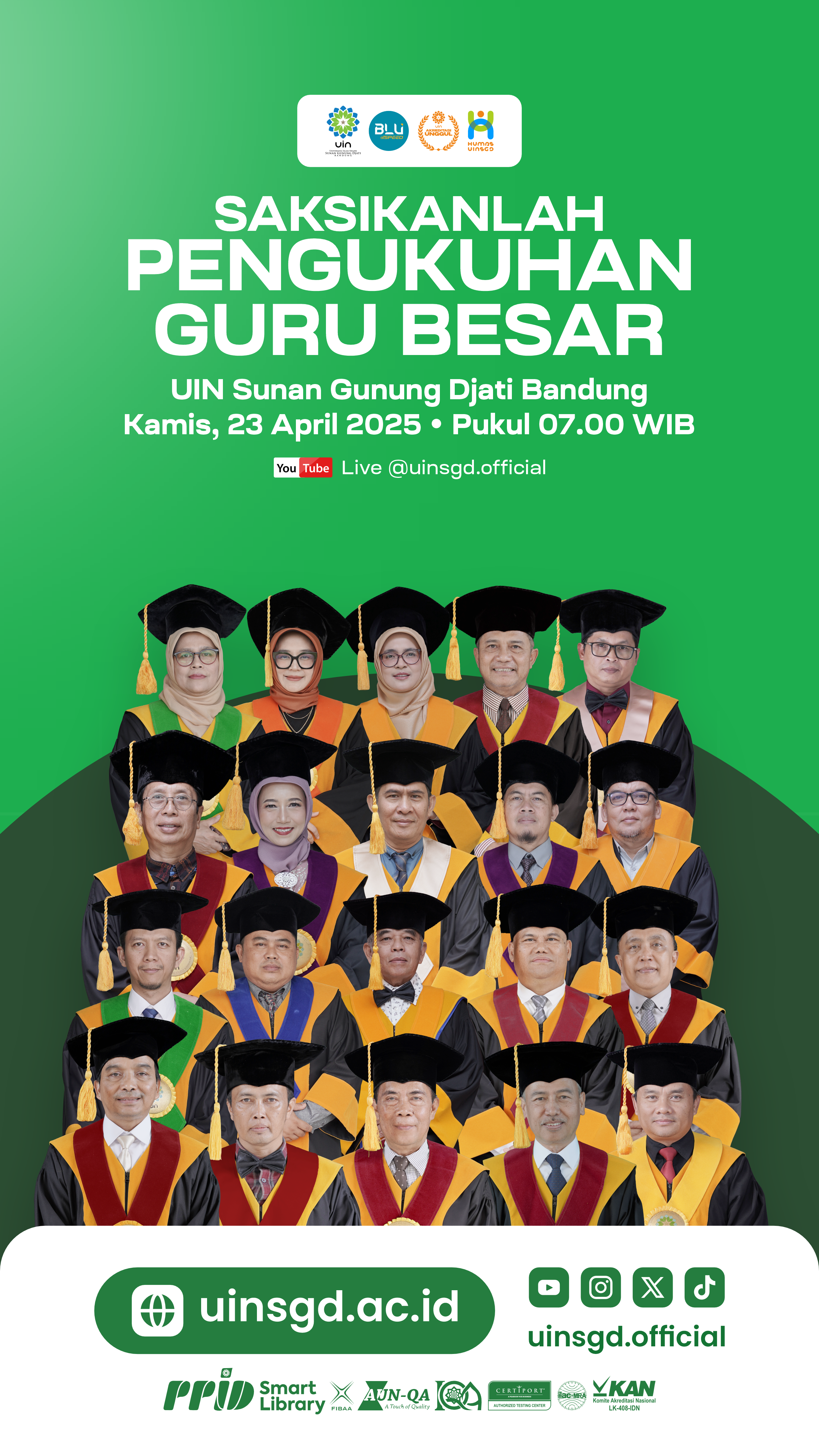 Untuk menyaksikan Pengukuhan 20 Guru Besar UIN Sunan Gunung Djati Bandung 2025 dapat ditonton melalui kanal ini