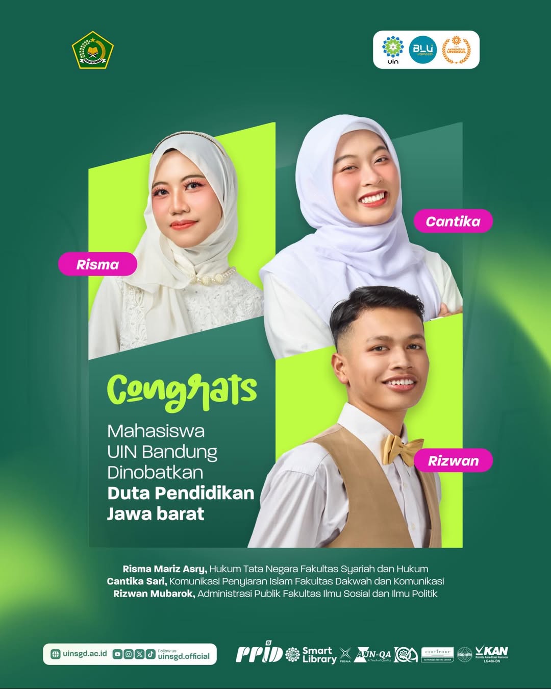 UINSGD.AC.ID (Humas) — Halo, SGD Fighters! Kabar baik datang dari tiga mahasiswa UIN Sunan Gunung Djati Bandung yang berhasil dinobatkan sebagai Duta Pendidikan Jawa Barat.
