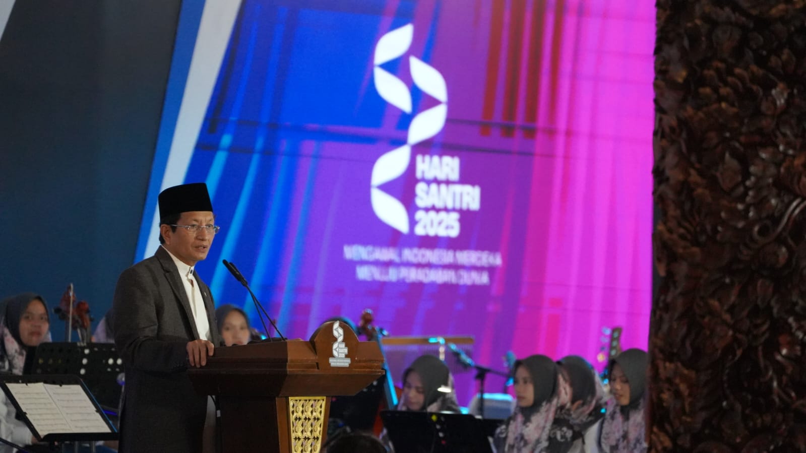 UINSGD.AC.ID (Humas) — Menteri Agama Nasaruddin Umar menyampaikan terima kasih kepada Presiden Prabowo atas perhatiannya ke dunia pesantren. Hal ini disampaikan Menag Nasaruddin Umar saat memberikan sambutan pada Malam Bakti Santri untuk Negeri di TMII, Jakarta.