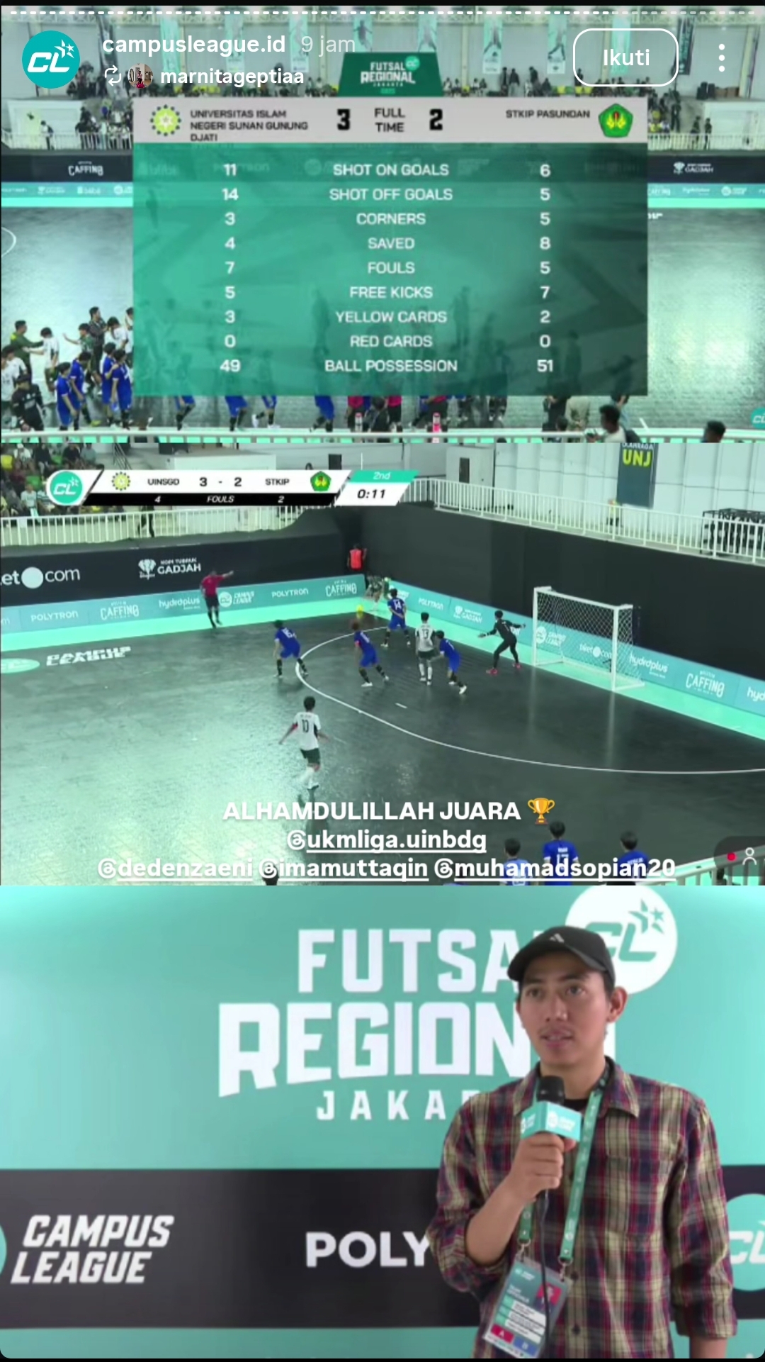Kemenangan dramatis itu menegaskan kualitas dan konsistensi tim futsal UIN Bandung dalam memadukan taktik, kerja sama tim, serta mental bertanding di level kompetitif kampus regional. Sorak dukungan suporter turut memenuhi arena pertandingan dan menambah semangat para pemain hingga peluit panjang dibunyikan.