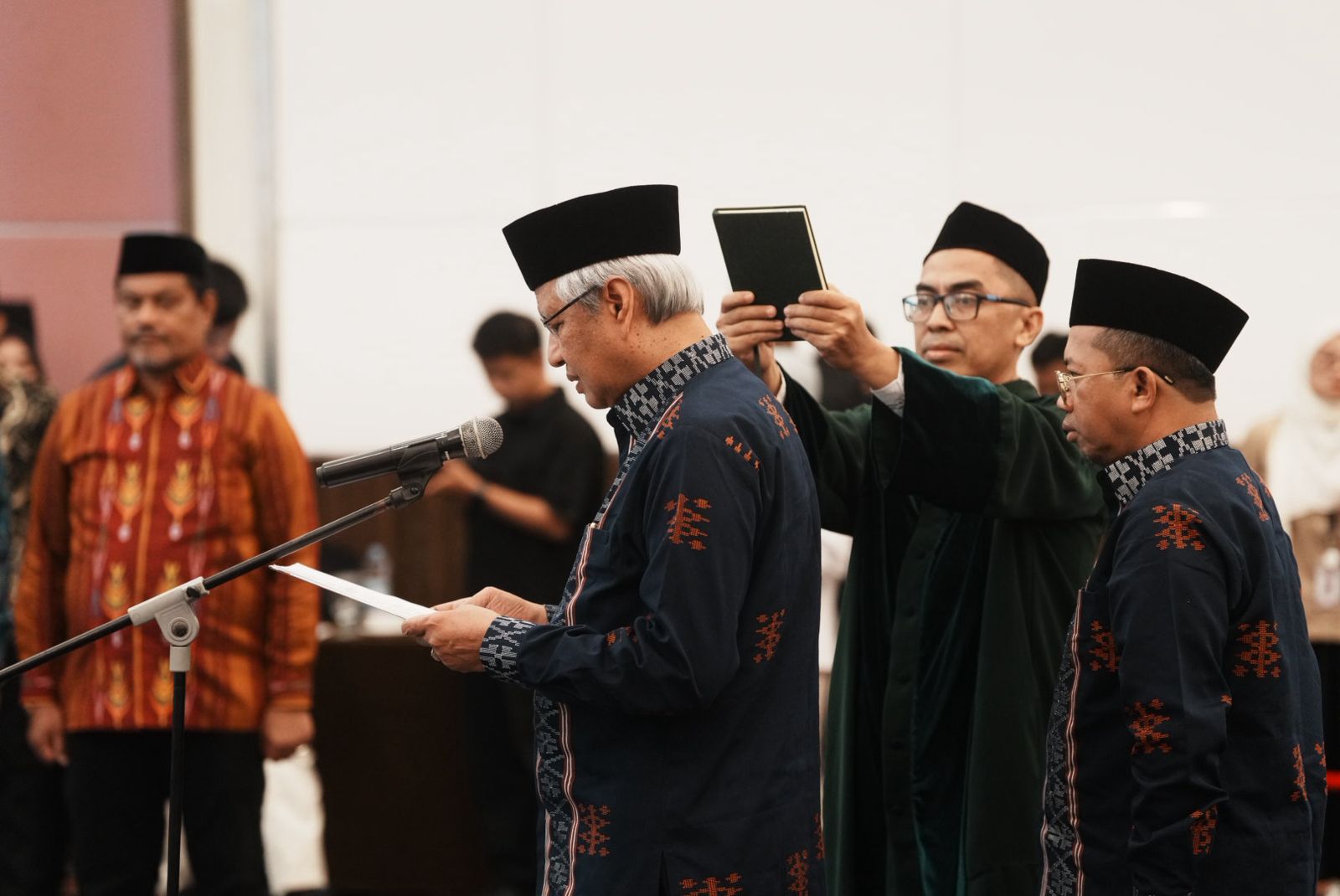 Pelantikan berlangsung di Kendari, Sulawesi Tenggara, ditandai dengan pembacaan bai’at jabatan dan pemasangan baju toga kepada para dewan hakim.