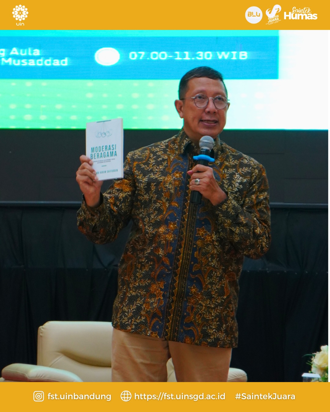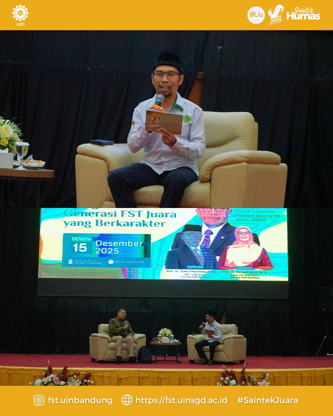 UINSGD.AC.ID (Humas) — Upaya membentuk mahasiswa berkarakter moderat dan inklusif terus dilakukan Fakultas Sains dan Teknologi (FST) UIN Sunan Gunung Djati Bandung melalui Seminar Merawat Moderasi Beragama untuk Generasi FST Juara yang Berkarakter bersama Dr. (H.C.) Drs. H. Lukman Hakim Saifuddin, M.Si., Menteri Agama RI Periode 2014–2019. Seminar yang dipandu Dr. H. Aep Saepuloh, M.Si., ini berlangsung di Gedung Anwar Musaddad, Senin (15/12/2025).