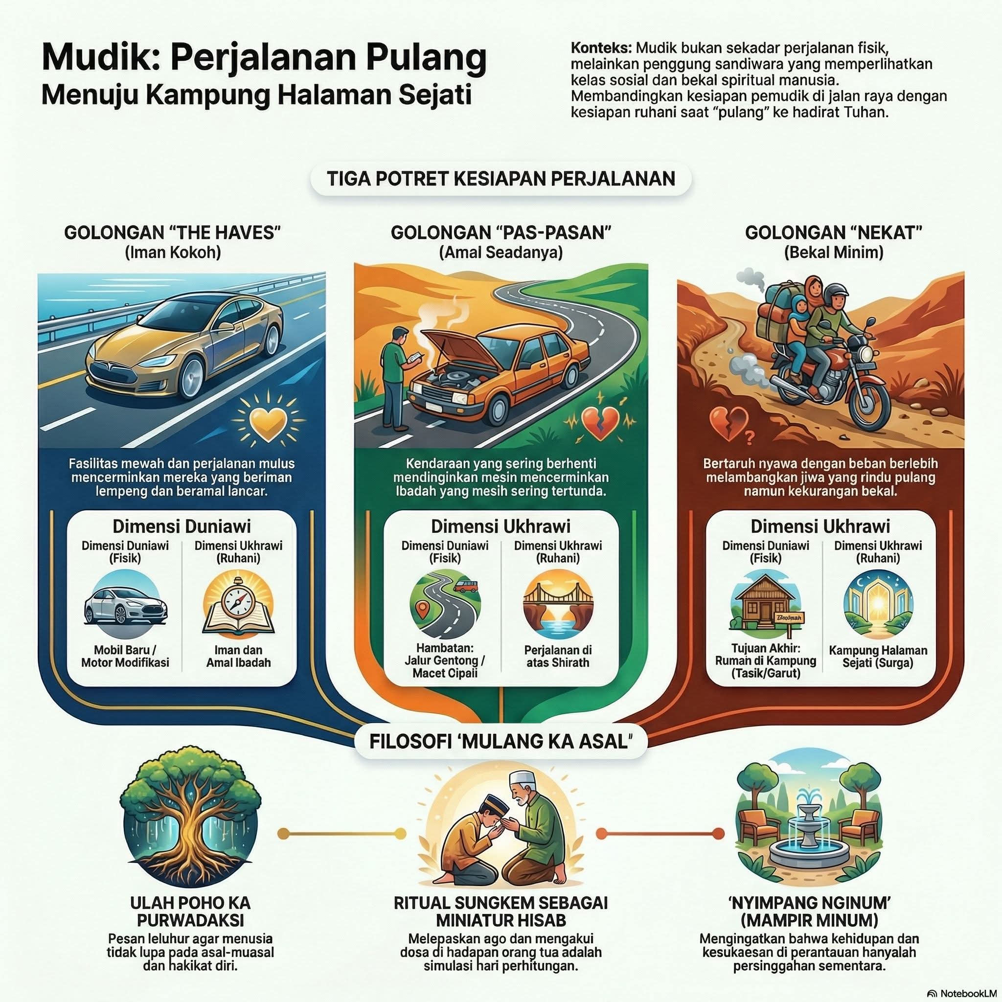 Di akhir perjalanan mudik nanti, ada ritual sungkem dan halal bi halal. Kita bersimpuh, melepaskan ego, dan mengakui dosa. Inilah miniatur hari perhitungan kelak. Di akhirat, tak ada lagi urusan merek mobil atau jabatan di kantor. Yang ada hanyalah: “Apa yang kamu bawa untuk pulang?”