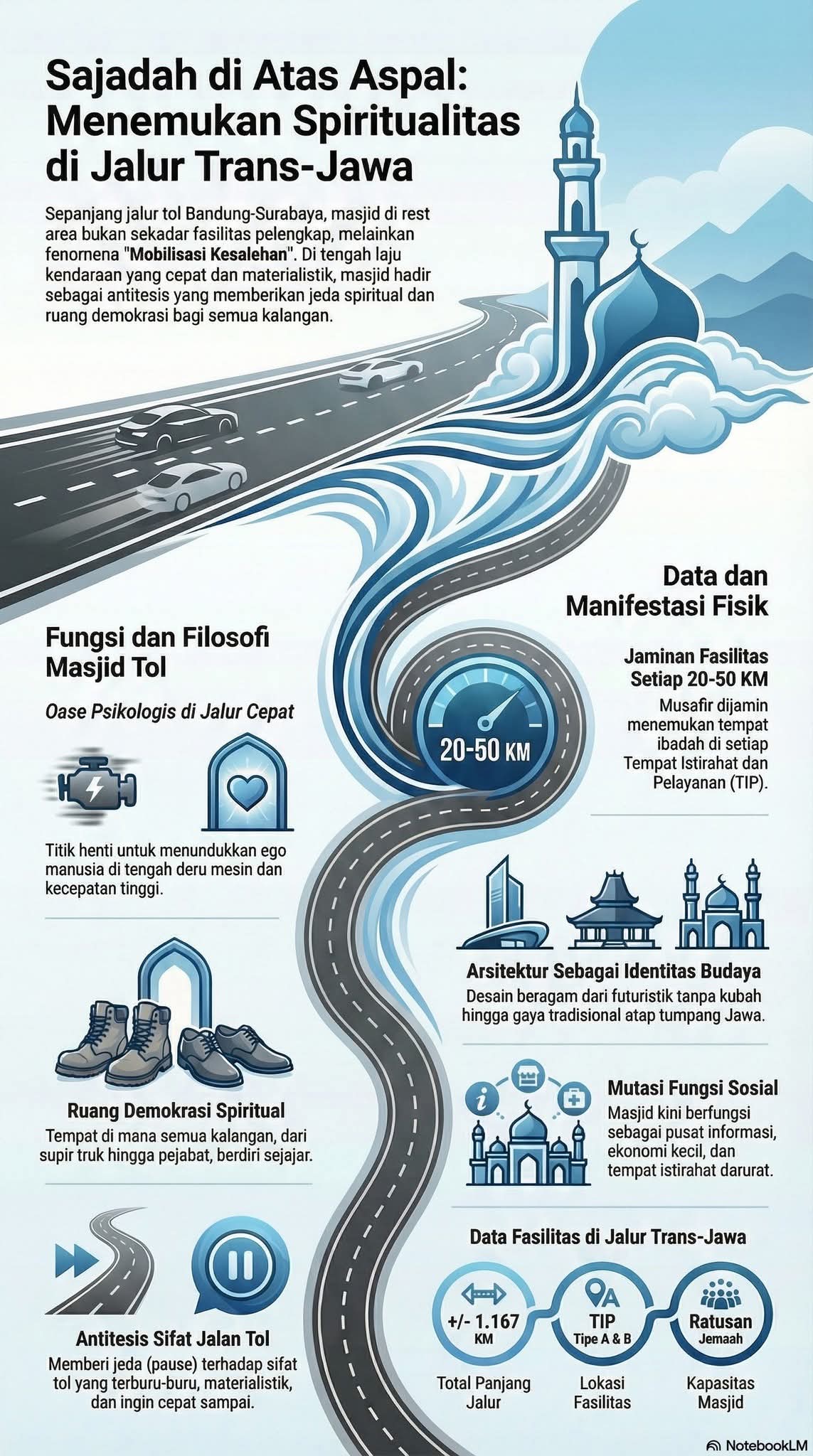 Argumennya sederhana saja, bahwa di balik gemerlap lampu dasbor dan deru knalpot, orang Indonesia itu memiliki “ketakutan yang purba” akan keterasingan dari Tuhannya saat berada di perjalanan. Maka, kehadiran tempat sujud di setiap jarak 20 hingga 50 kilometer itu adalah jawaban atas kebutuhan rasa aman yang metafisik. Mesjid menjadi “existensial break” yang mengondisikan setiap muslim untuk meraih “thumaninah” (ketenangan batin) di tengah hiruk pikuk duniawi.