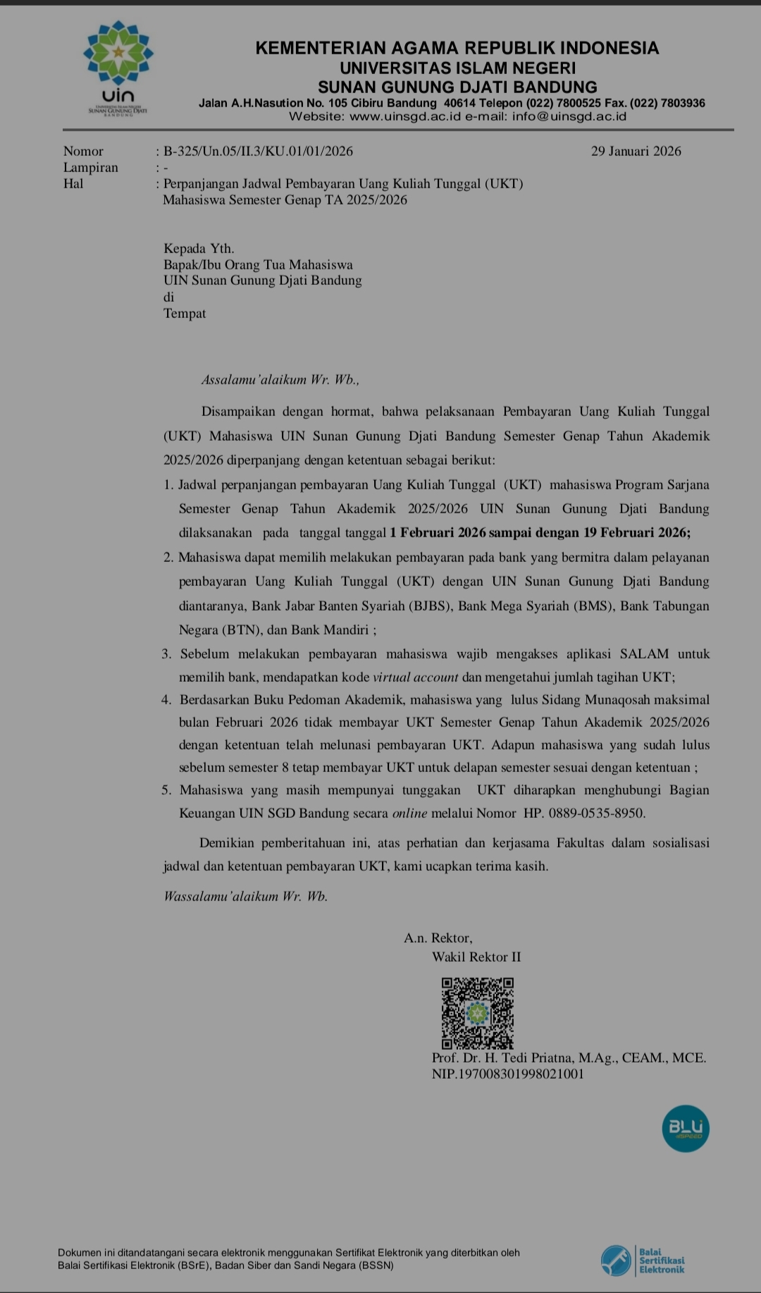 UINSGD.AC.ID (Humas) –Disampaikan dengan hormat, bahwa pelaksanaan Pembayaran Uang Kuliah Tunggal (UKT) Mahasiswa UIN Sunan Gunung Djati Bandung Semester Genap Tahun Akademik 2025/2026 diperpanjang dengan ketentuan sebagai berikut: