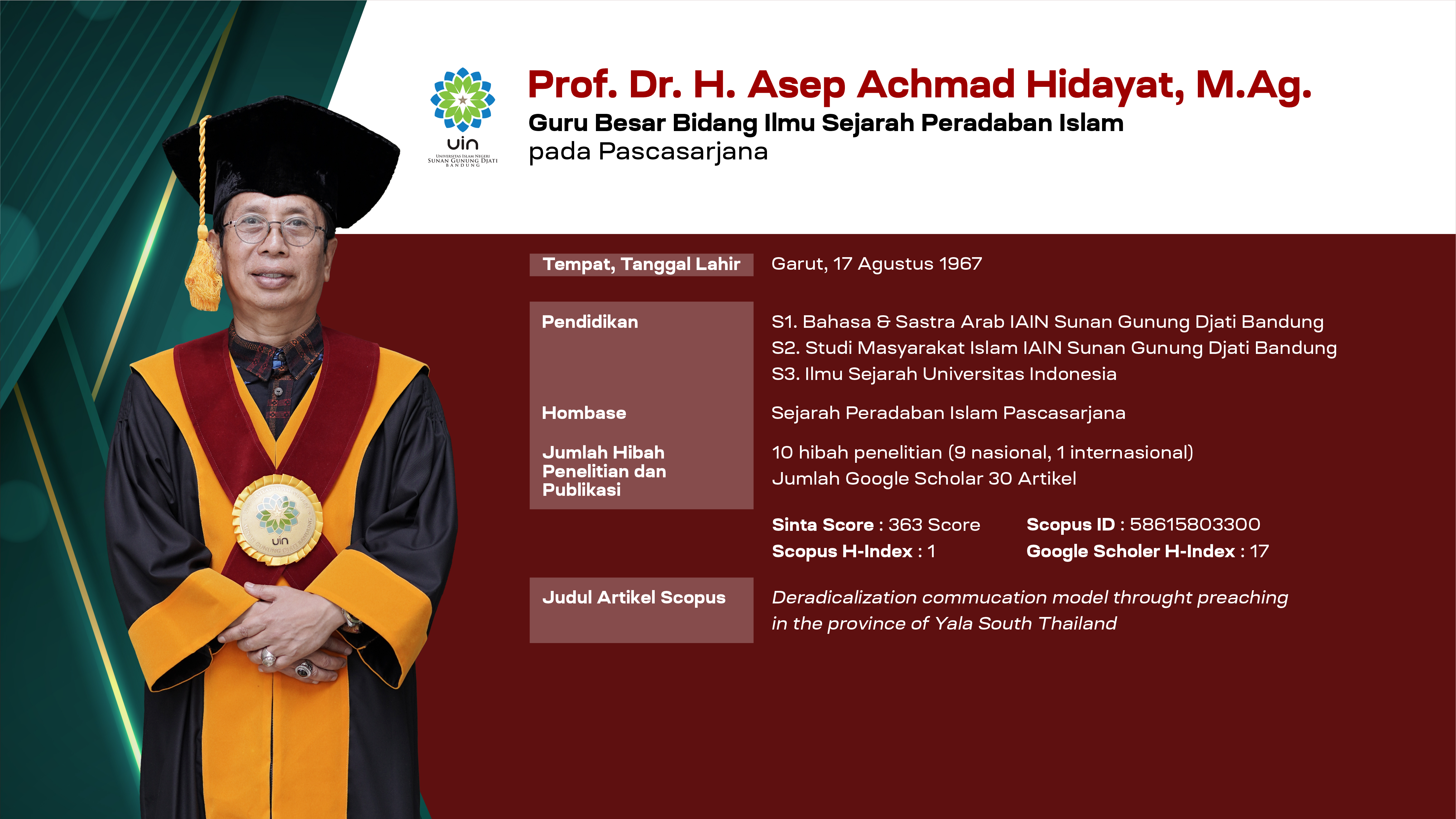 Untuk mengetahui Naskah lengkap Pidato Pengukuhan Guru Besar Bidang Ilmu Sejarah Peradaban Islam—yang disampaikan pada Sidang Senat Terbuka UIN Sunan Gunung Djati Bandung di Gedung Anwar Musaddad dan disiarkan langsung melalui kanal YouTube resmi UIN Sunan Gunung Djati Bandung pada Rabu, 23 April 2025—dapat diunduh di laman berikut ini.