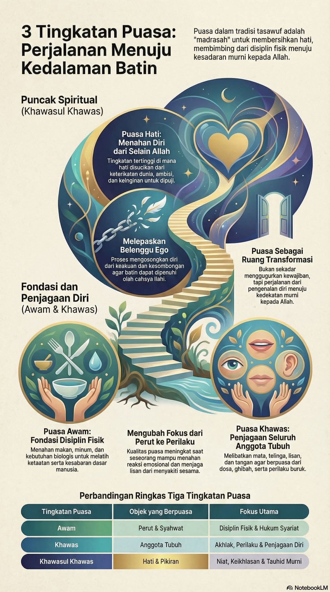Saya sendiri sering merasa bahwa puasa saya berhenti di tingkat pertama. Kadang naik sedikit ke tingkat kedua. Tetapi tingkat ketiga—membiarkan ego benar-benar lapar—itu medan yang sunyi dan sulit.