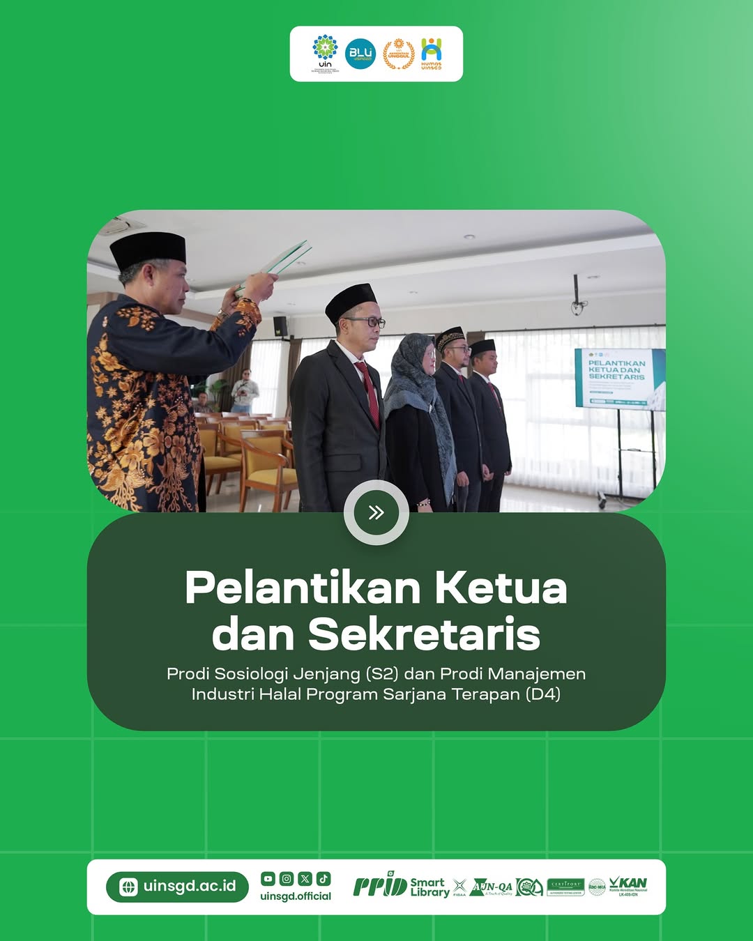 Empat pejabat yang dilantik itu Ketua Prodi Sosiologi S2, Dr. Dede Syarif, S.Sos., M.Ag., Sekretaris Dr. Endah Ratna Sonya, S.Sos., M.Si.; Ketua Prodi Manajemen Industri Halal (D4),