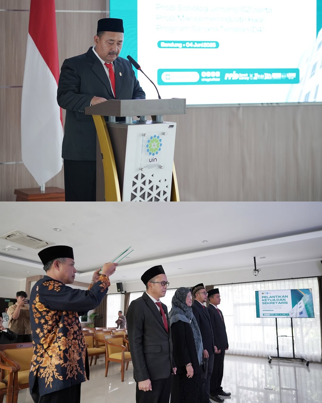 UINSGD.AC.ID (Humas) — Rektor UIN Sunan Gunung Djati Bandung, Prof. Dr. H. Rosihon Anwar, M.Ag., secara resmi melantik Ketua dan Sekretaris Program Studi Sosiologi jenjang S2; Program Studi Manajemen Industri Halal jenjang D4 yang berlangsung di Gedung O. Djauharuddin AR, Kamis (5/6/2025).