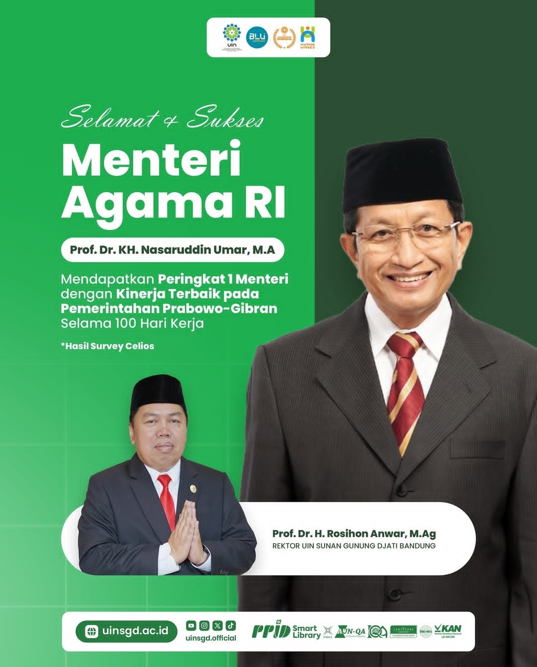 UINSGD.AC.ID (Humas) – Rektor UIN Sunan Gunung Djati Bandung, Prof. Rosihon Anwar, memberikan apresiasi kepada Menteri Agama, Nasaruddin Umar, yang dinobatkan sebagai menteri dengan kinerja terbaik dalam Kabinet Merah Putih (KMP) pada 100 hari pertama pemerintahan Prabowo-Gibran.