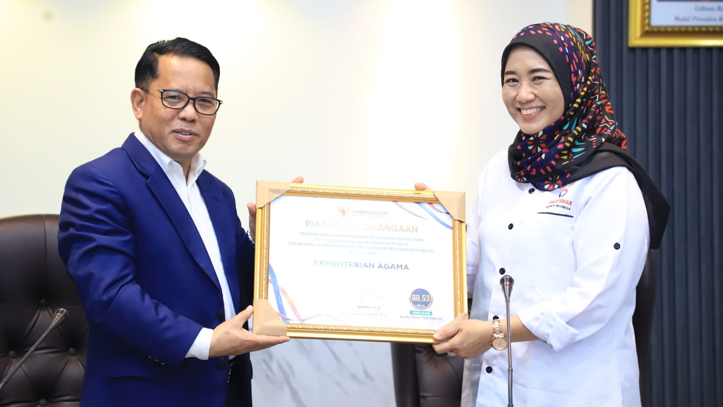 Penghargaan ini diberikan Kepala Keasistenan Manajemen Pengetahuan Ombudsman RI, Aat Sugihartati kepada Sekretaris Jenderal Kemenag RI, Kamaruddin Amin di Kantor Pusat kemenag RI, Jakarta.