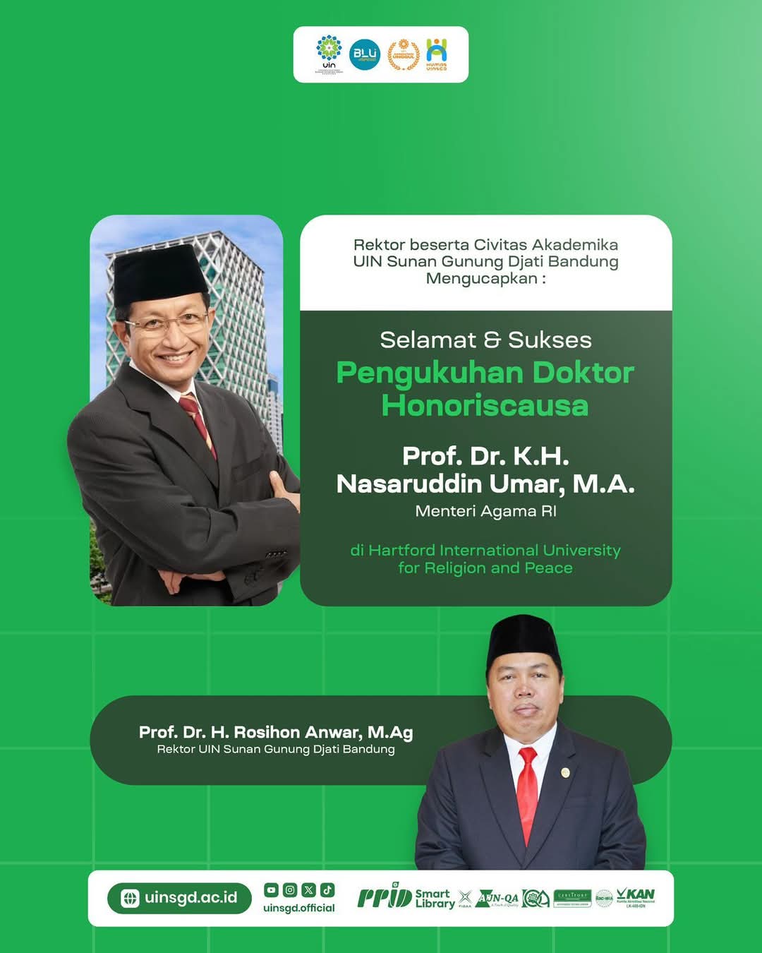 Rektor UIN Sunan Gunung Djati Bandung Prof. Dr. Rosihon Anwar, M.Ag., menyampaikan penganugerahan ini menjadi kebanggaan tersendiri bagi bangsa Indonesia, khususnya umat Islam. “Kami sangat mengapresiasi capaian luar biasa atas gelar ini dan menjadi bukti pengakuan dunia terhadap komitmen dan kontribusi Prof. Nasaruddin dalam memperjuangkan nilai-nilai moderasi, perdamaian, dialog antaragama,” ujarnya.