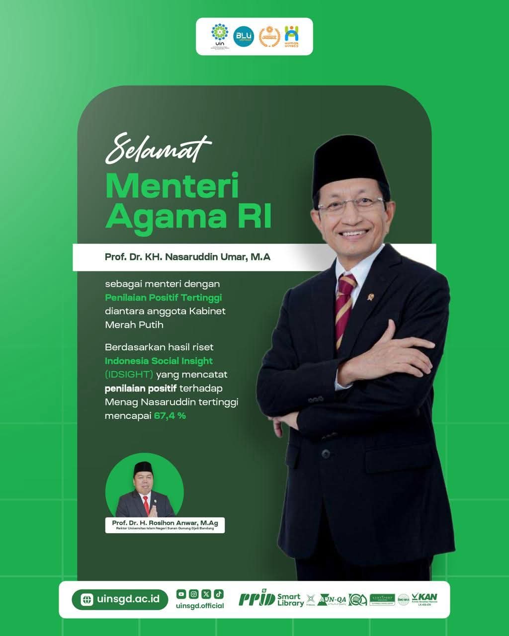 UINSGD.AC.ID (Humas) — Menteri Agama Republik Indonesia, Prof. Dr. KH. Nasaruddin Umar, M.A., meraih penilaian positif tertinggi di antara anggota Kabinet Merah Putih. Berdasarkan hasil riset Indonesia Social Insight (IDSIGHT), tingkat penilaian positif terhadap Menag Nasaruddin mencapai 67,4 persen.
