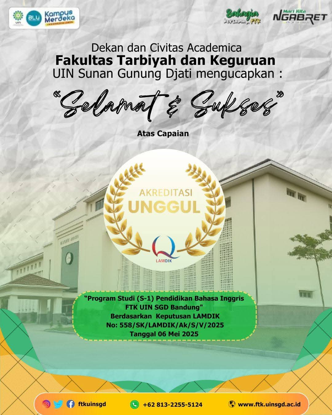 Dengan capaian ini, Prodi Pendidikan Bahasa Inggris Fakultas Tarbiyah dan Keguruan (FTK) UIN Bandung diharapkan semakin diakui sebagai program studi yang berkualitas, profesional, dan mampu melahirkan lulusan yang kompeten serta siap bersaing di tingkat nasional maupun internasional.