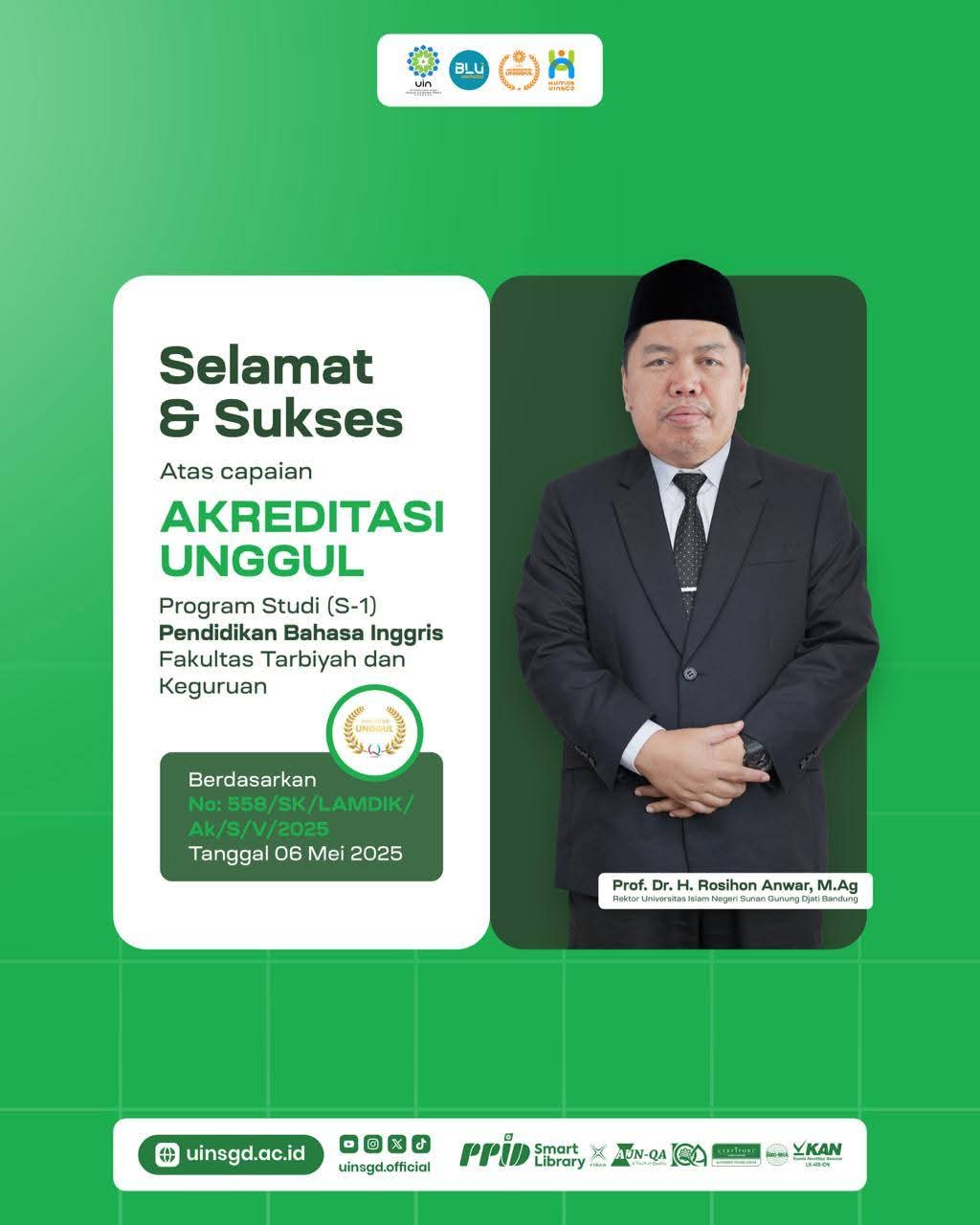 Dengan capaian ini, Prodi Pendidikan Bahasa Inggris Fakultas Tarbiyah dan Keguruan (FTK) UIN Bandung diharapkan semakin diakui sebagai program studi yang berkualitas, profesional, dan mampu melahirkan lulusan yang kompeten serta siap bersaing di tingkat nasional maupun internasional.