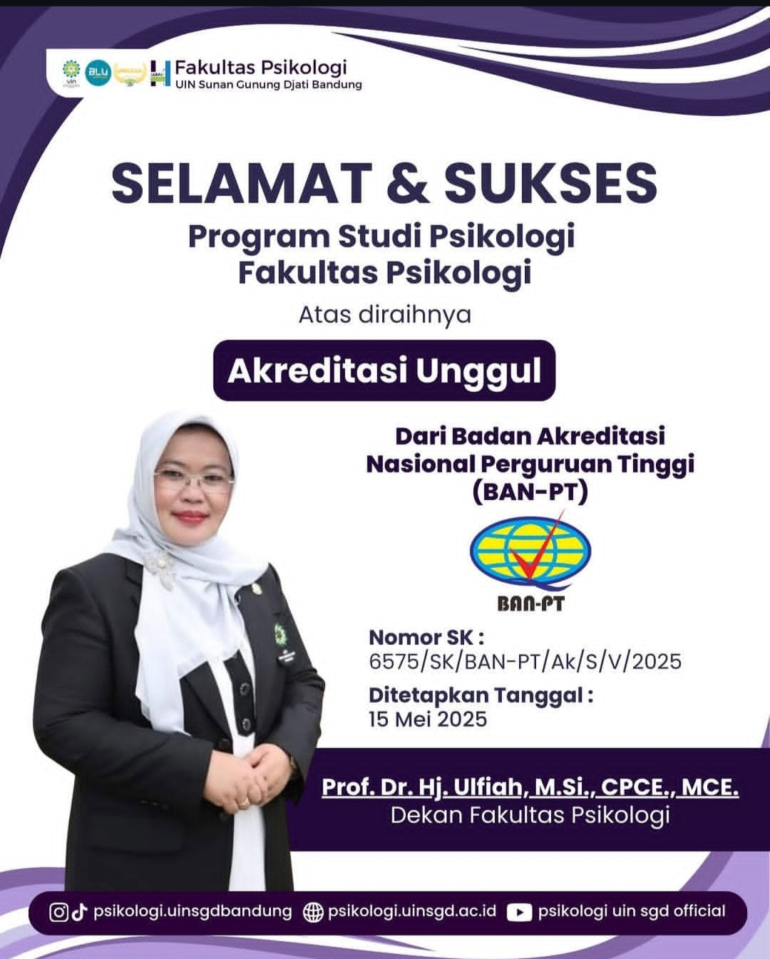 UINSGD.AC.ID (Humas) — Kabar membanggakan datang dari Fakultas Psikologi UIN Sunan Gunung Djati Bandung. Program Studi Psikologi resmi meraih Akreditasi Unggul dari Badan Akreditasi Nasional Perguruan Tinggi (BAN-PT) berdasarkan SK Nomor: 6575/SK/BAN-PT/Ak/S/V/2025, yang ditetapkan pada 15 Mei 2025.