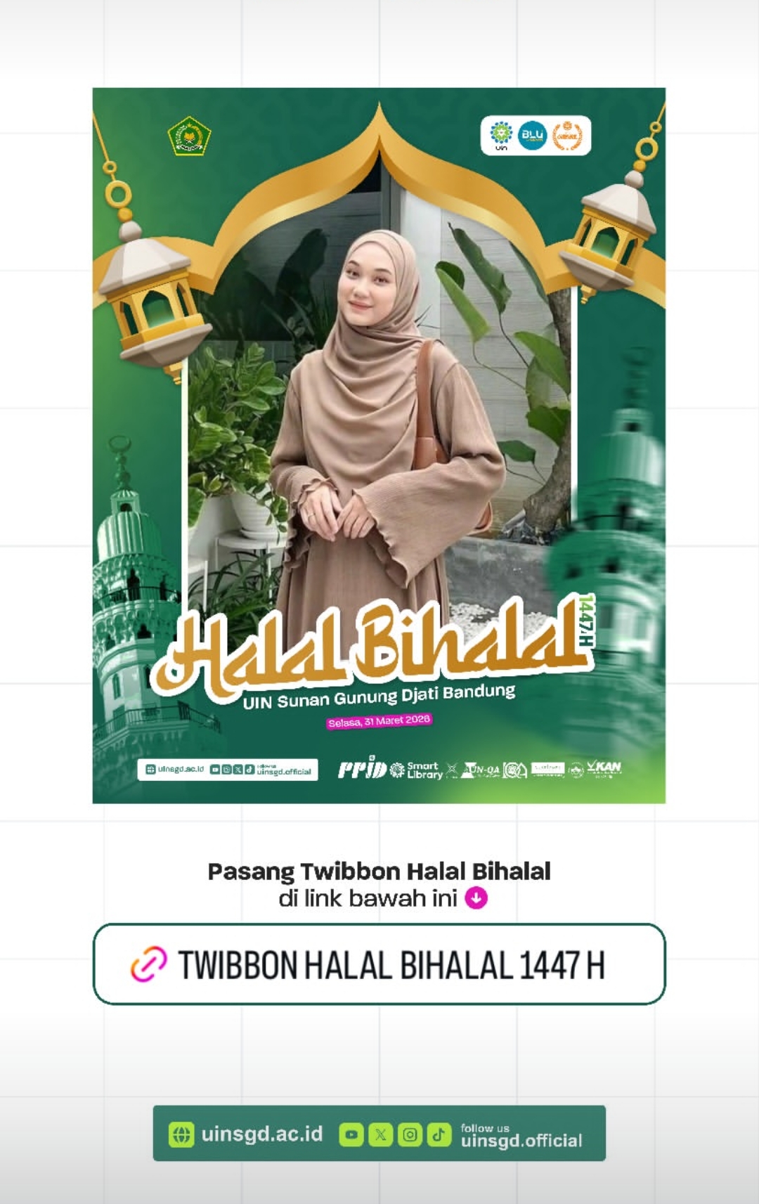 UINSGD.AC.ID (Humas) — Dalam rangka menyemarakkan momentum kebersamaan pasca Idulfitri 1447 Hijriah, UIN Sunan Gunung Djati Bandung mengajak seluruh sivitas akademika untuk turut berpartisipasi memasang twibbon Halal Bihalal.