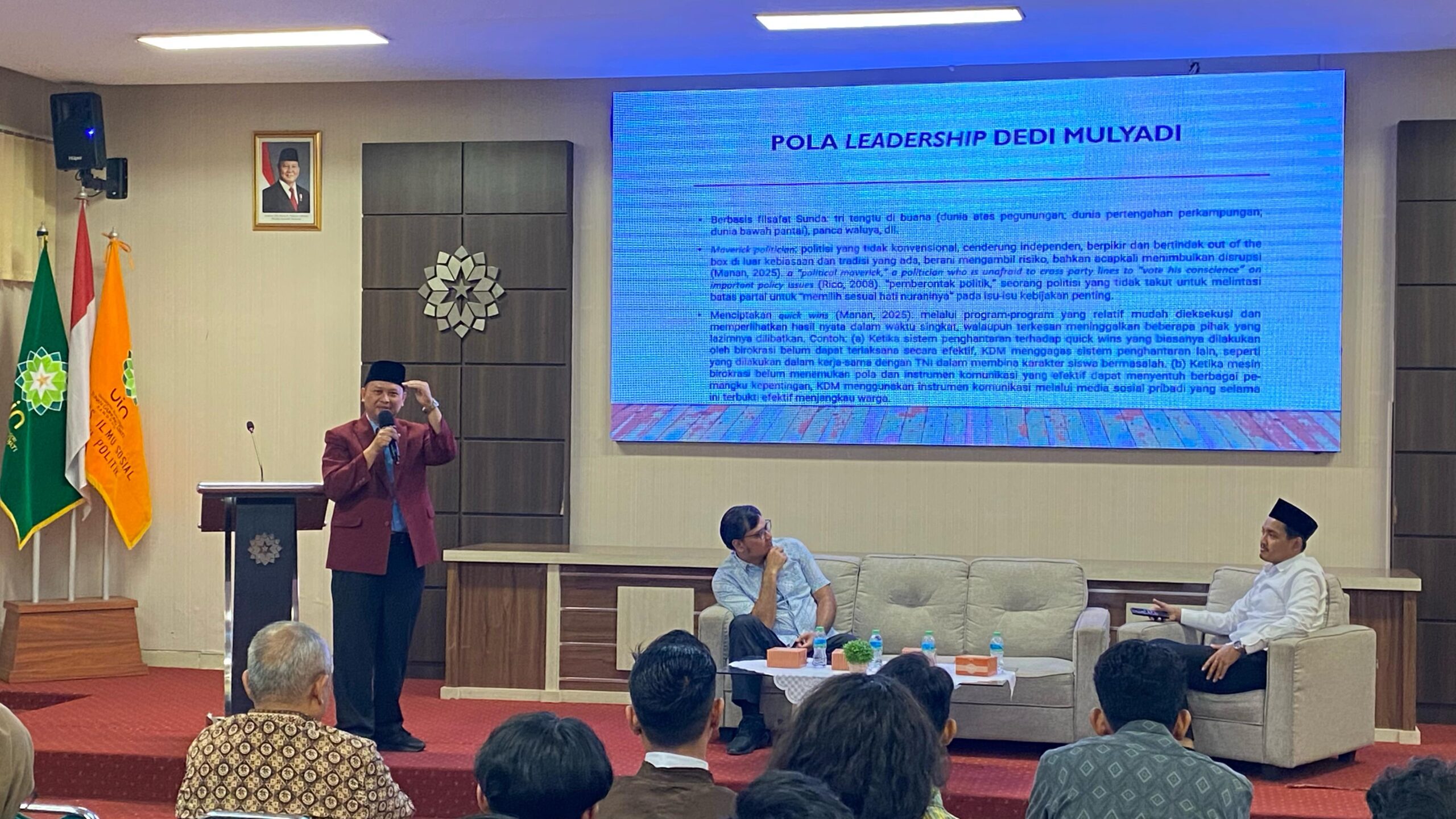 Sementara itu, Dr. Hasan Mustapa membawakan materi berjudul “Populisme dan Politik Pembangunan Dedi Mulyadi” yang menganalisis gaya kepemimpinan dan strategi komunikasi politik mantan Bupati Purwakarta tersebut, khususnya dalam memanfaatkan media sosial sebagai modal sosial-politik.