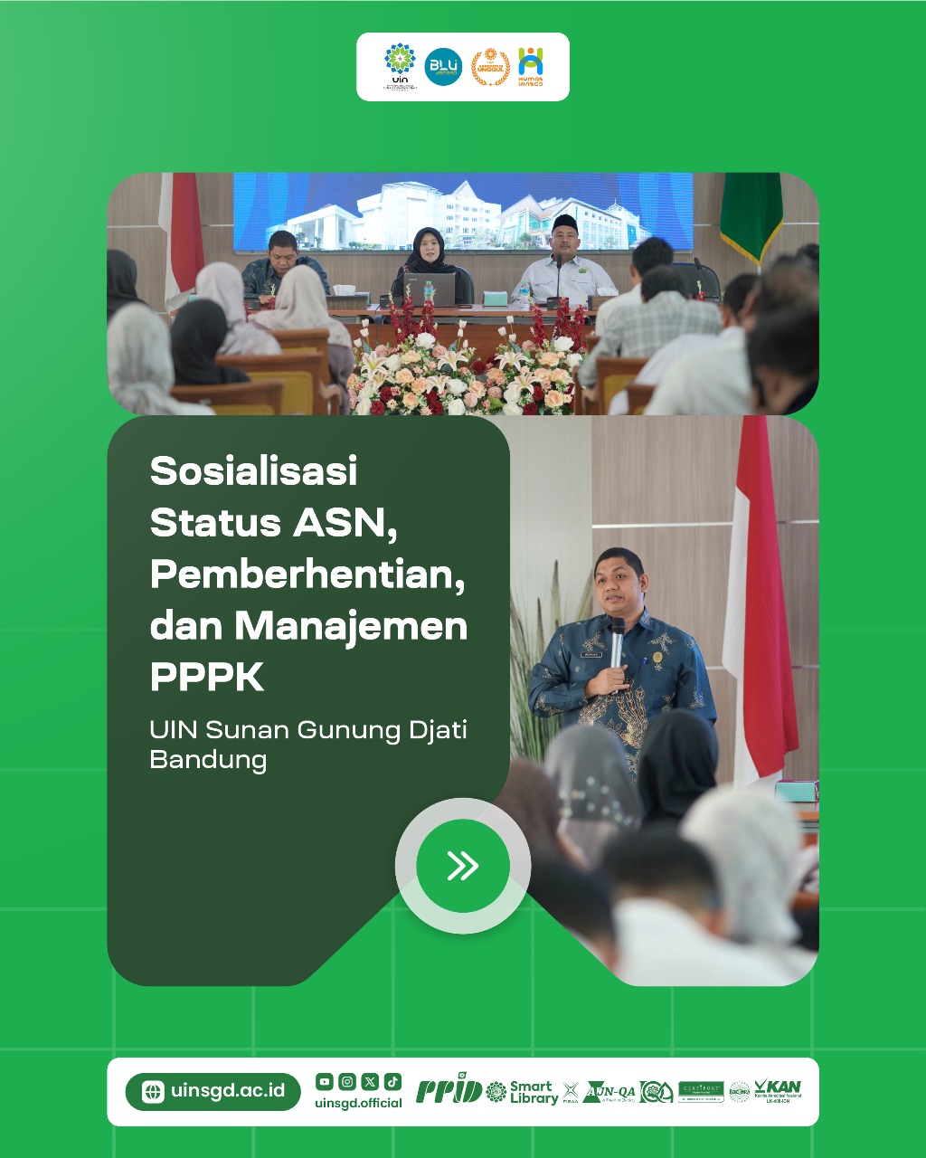 UINSGD.AC.ID (Humas) — Dalam rangka meningkatkan pemahaman regulasi kepegawaian, UIN Sunan Gunung Djati Bandung menyelenggarakan Sosialisasi Status Aparatur Sipil Negara (ASN), Pemberhentian, dan Manajemen Pegawai Pemerintah dengan Perjanjian Kerja (PPPK) yang diikuti 140 peserta di Gedung O. Djauharuddin AR, Selasa (9/12/2025).