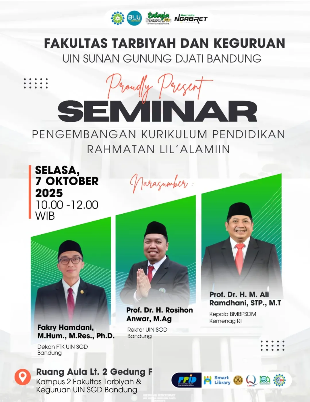 Dengan menghadirkan tiga narasumber utama: Prof. Dr. H. Rosihon Anwar, M.Ag., Rektor UIN Sunan Gunung Djati Bandung; Prof. Dr. H. M. Ali Ramdhani, STP., M.T., Kepala Badan Moderasi Beragama dan Pengembangan Sumber Daya Manusia (BMBPSDM) Kementerian Agama RI; Fakry Hamdani, M.Hum., M.Res., Ph.D., Dekan Fakultas Tarbiyah dan Keguruan (FTK) UIN Sunan Gunung Djati Bandung.