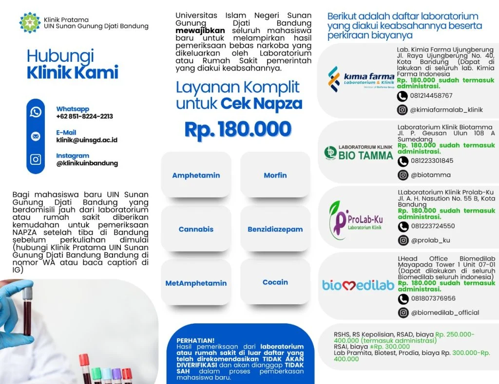 UINSGD.AC.ID (Humas) — Salah satu syarat wajib dalam proses pemberkasan bagi calon mahasiswa baru UIN Sunan Gunung Djati Bandung adalah melampirkan atau mengunggah Surat Keterangan Bebas Narkoba. Surat ini dapat diperoleh melalui tes narkoba di laboratorium milik RSUD, RS POLRI, RS TNI, atau laboratorium/klinik yang memiliki izin resmi.